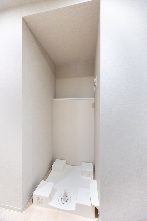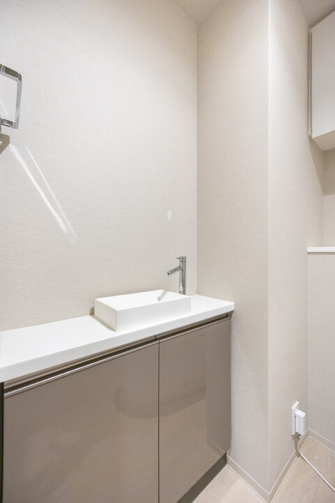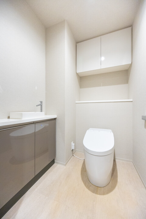 廊下の突き当たりにあり、独立性の高いレストルーム。すっきりとした見た目のタンクレストイレを採用しています。手洗いカウンター付きなのですぐに手を洗うことができ、ゲストを洗面室まで案内する手間もかかりません。トイレットペーパーや掃除用品は吊戸棚に収納してくださいね。