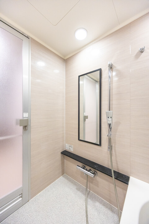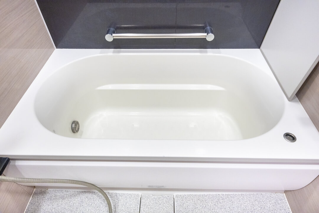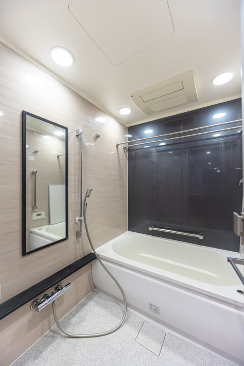 木目&ブラックのパネルを採用し、スタイリッシュな雰囲気が漂うバスルーム。丸みを帯びた浴槽が疲れた身体を包み込んでくれそうです。浴室換気乾燥暖房機・追い焚き機能搭載で1年中快適なバスタイムをお過ごしいただけます。