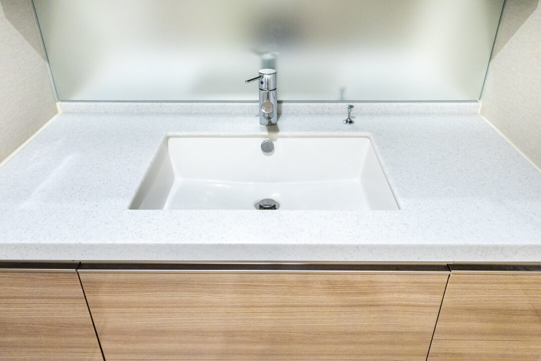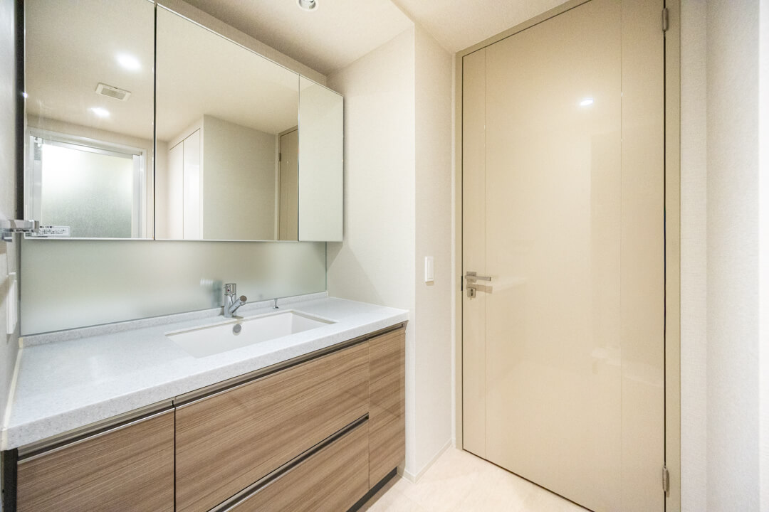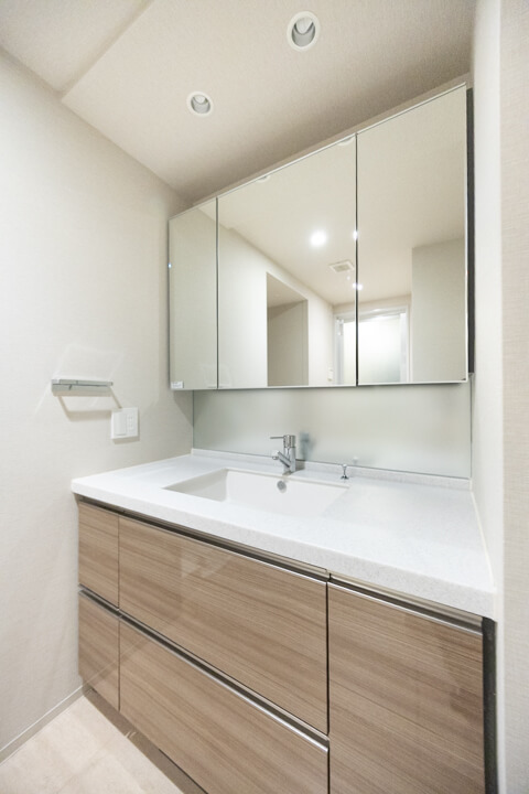 広々とした石調カウンターが高級感を演出する洗面化粧台。大きな三面鏡付きで身だしなみを整えるのに便利です。洗面台本体の収納に加え、大容量のリネン庫も完備。洗面まわりの小物からタオルやパジャマ、洗剤のストックまでたっぷり収納できます。いつも清潔な洗面室をキープできそうですね。