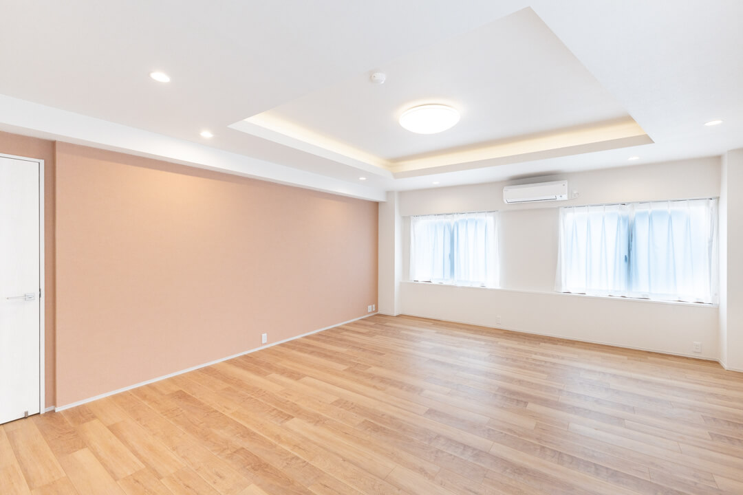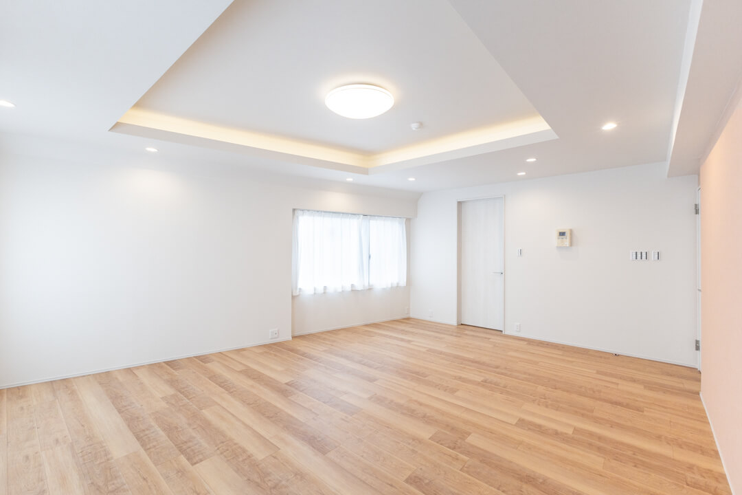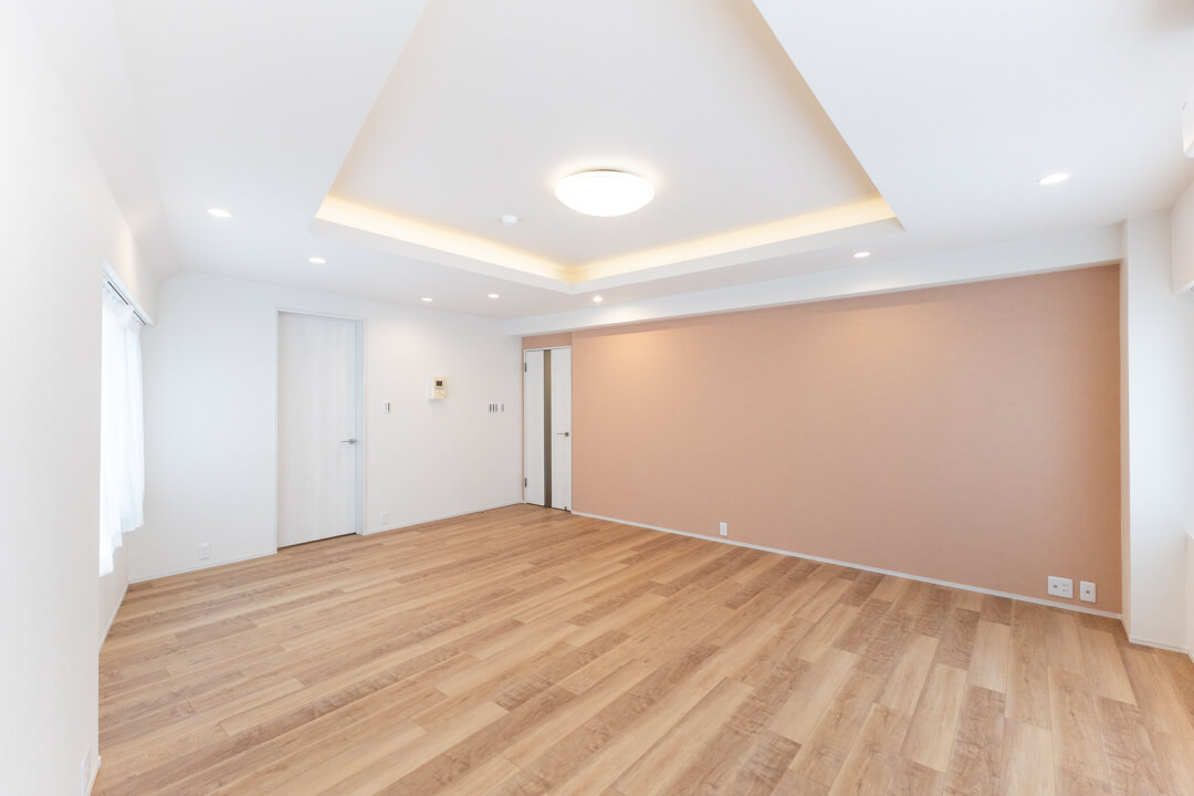 北西2面採光で光と風が抜ける心地よいリビングスペース。白いクロスと木目フローリングのナチュラルな空間に、カラークロスがほどよいアクセントを添えています。折り上げ天井に施された間接照明もポイント。光のグラデーションが陰影を作り出し、落ち着いた雰囲気を演出します。約15帖の空間です。