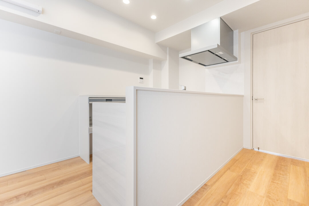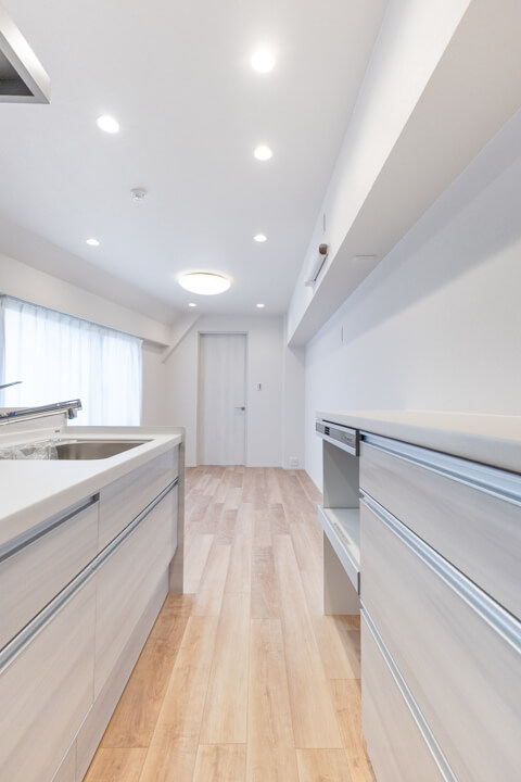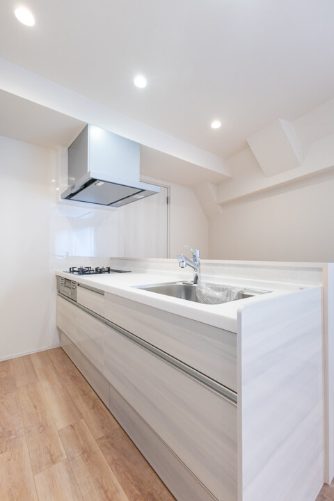 明るいデザインが空間に調和するキッチン。グリル付3口ガスコンロ・食洗機内蔵で調理も後片付けも捗ります。開放的に作業ができる対面タイプでありながら、立ち上がり壁が手元を隠し、生活感をさりげなくカバーできるのがポイントです。
