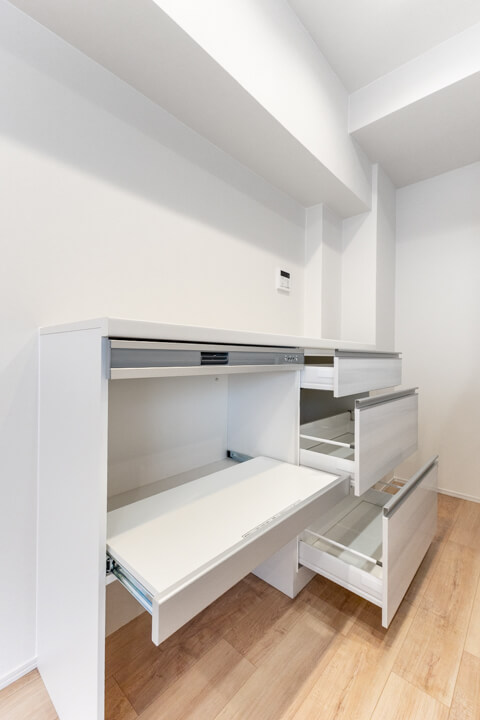 背面には収納力のあるカップボードを完備。キッチンと同じデザインで統一感があります。食料品のストックや食器類を整理整頓でき、ごちゃごちゃしがちなキッチンまわりがすっきり片付きそうですね。引出し可能なトレーボードには自動で蒸気を排出する機能が付いているので、収納したままご飯を炊いたり、お湯を沸かすことができて便利です。