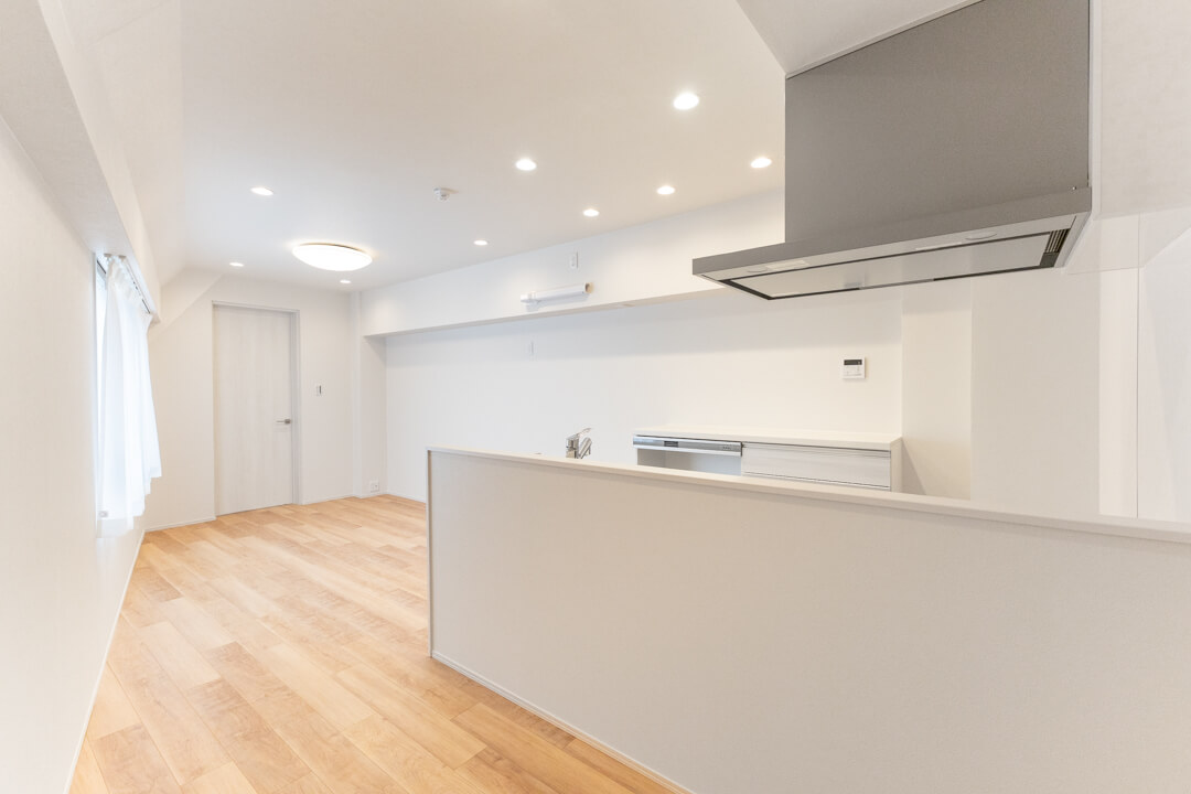 お隣にはダイニングキッチンがあります。リビングとしっかり空間分けされていることで、食事中のにおいがリビングスペースに届きにくかったり、生活感をカバーできるというメリットがあります。リラックスタイムと食事の時間のメリハリをつけて過ごしたいという方にはぴったりですね。また、お子さまが小さい場合は、食事に集中するという環境づくりができるのも良いかもしれません。