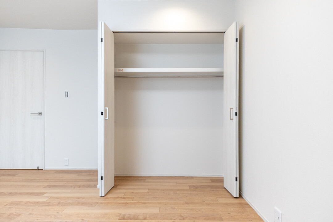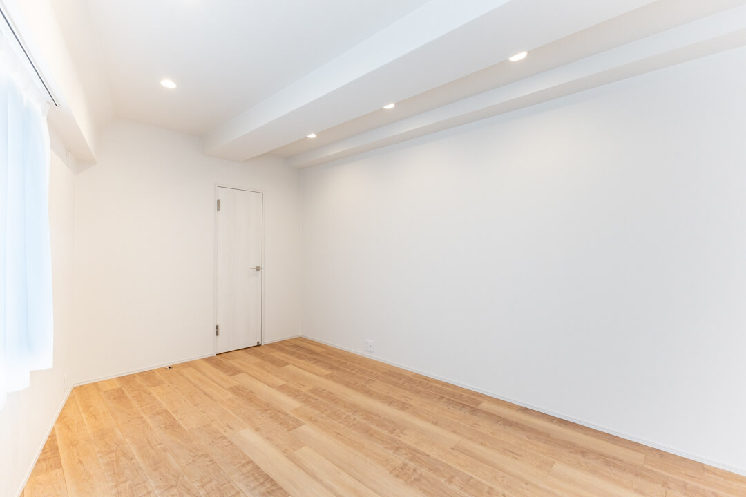 廊下に面していて独立性の高い主寝室。約10帖の広さがあり、ゆったり休めそうです。ナチュラルテイストな内装はインテリアを選ばず、家具選びの楽しみが広がりそうです。4枚折れ戸のクローゼット付きで、収納スペースもしっかり確保されています。