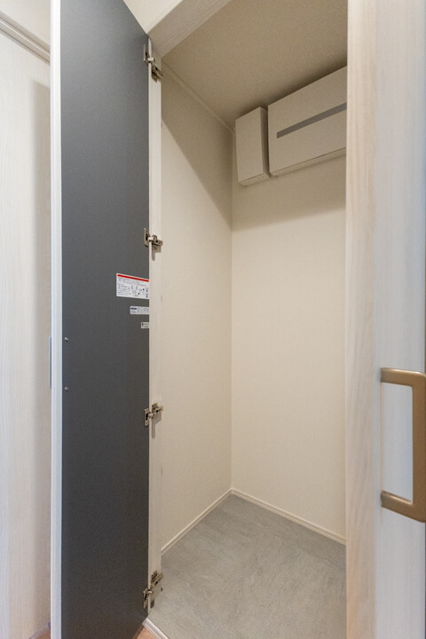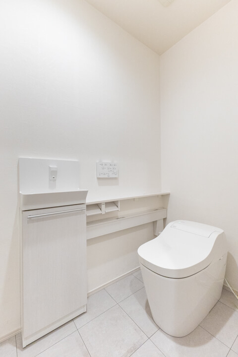 廊下に面していて独立性の高いレストルーム。Panasonic製の洗浄機能付トイレに交換済みです。タンクレス仕様でスタイリッシュ。便フタが自動開閉式なのも嬉しいポイントです。手洗いカウンター付きなのですぐに手を洗うことができ、ゲストを洗面室まで案内する手間もかかりません。ペーパーホルダーは取替えの手間が省ける2連タイプです。