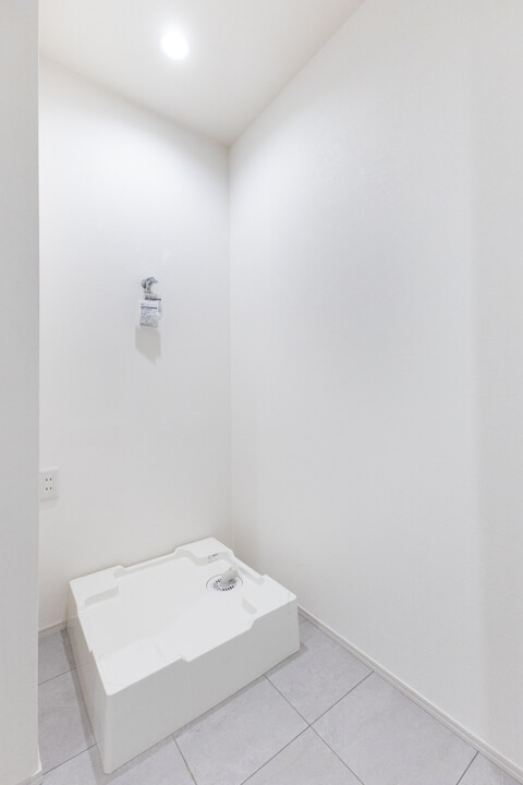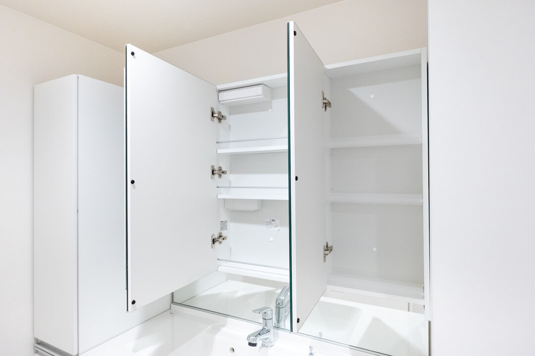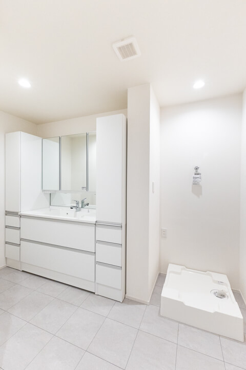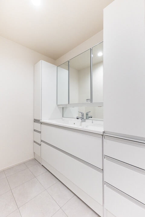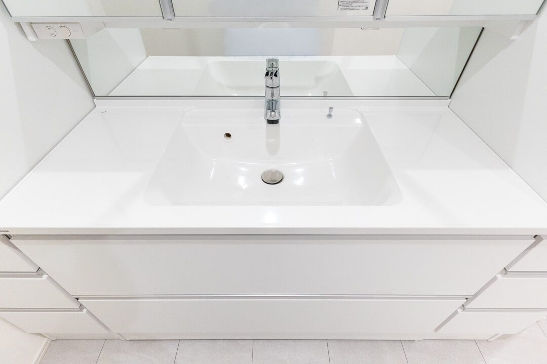白基調で清潔感のある洗面室。キャビネット付きで豊富な収納が魅力のひとつです。ミラーボックスも付いていて、洗面まわりの小物からタオル・パジャマ類までたっぷり収納できますよ。広々とした洗面ボウルはカウンターと一体成型。汚れが溜まりづらく、日々のお手入れも簡単です。