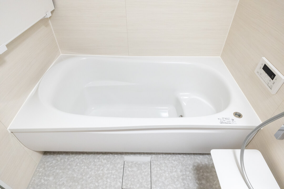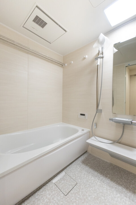 木目柄の壁パネルがやすらぎの空間を演出するバスルーム。換気・暖房・乾燥・涼風機能付きで1年中快適なバスタイムを過ごせます。追い焚き機能も付いているので、家族の入浴時間がずれてしまった時、半身浴をしたい時に便利。ベンチ付き浴槽なのも嬉しいポイントです。