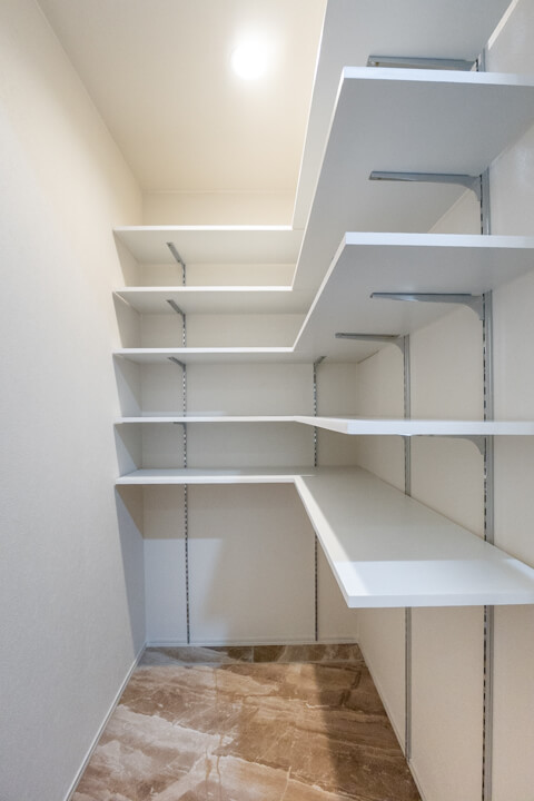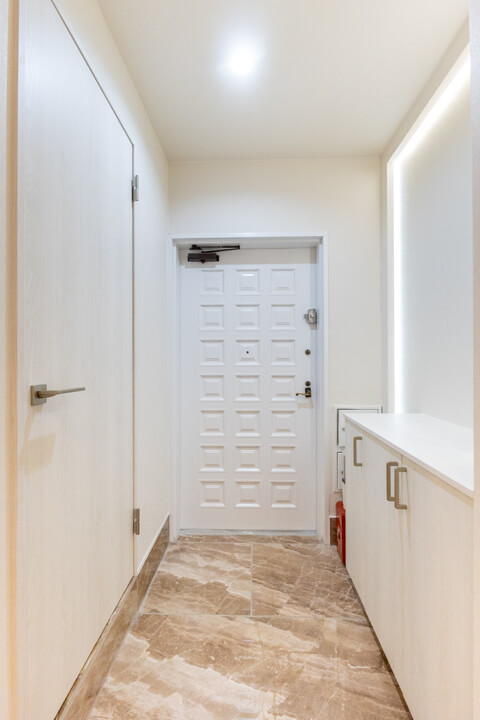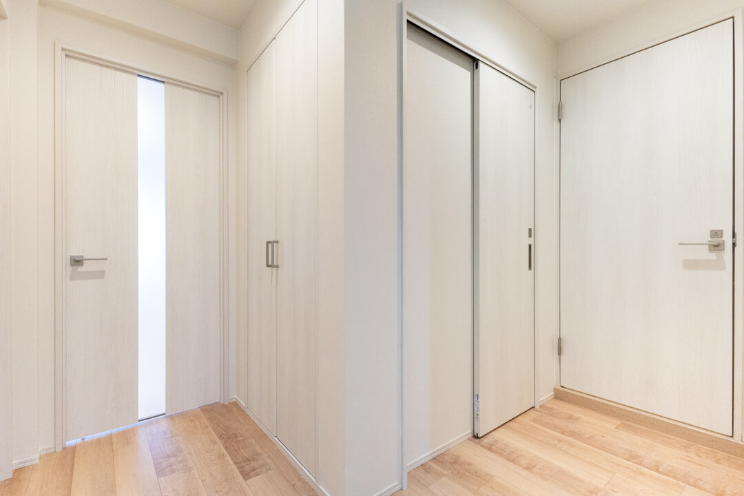 デザイン性のある扉が印象的な玄関。SIC(シューズインクローゼット)&シューズボックス完備で収納性に優れています。靴はもちろん、トランクケースや傘なども収納でき、すっきりとした空間でお出迎えできそうです。廊下にも収納があり、掃除機や季節家電の収納におすすめです。
