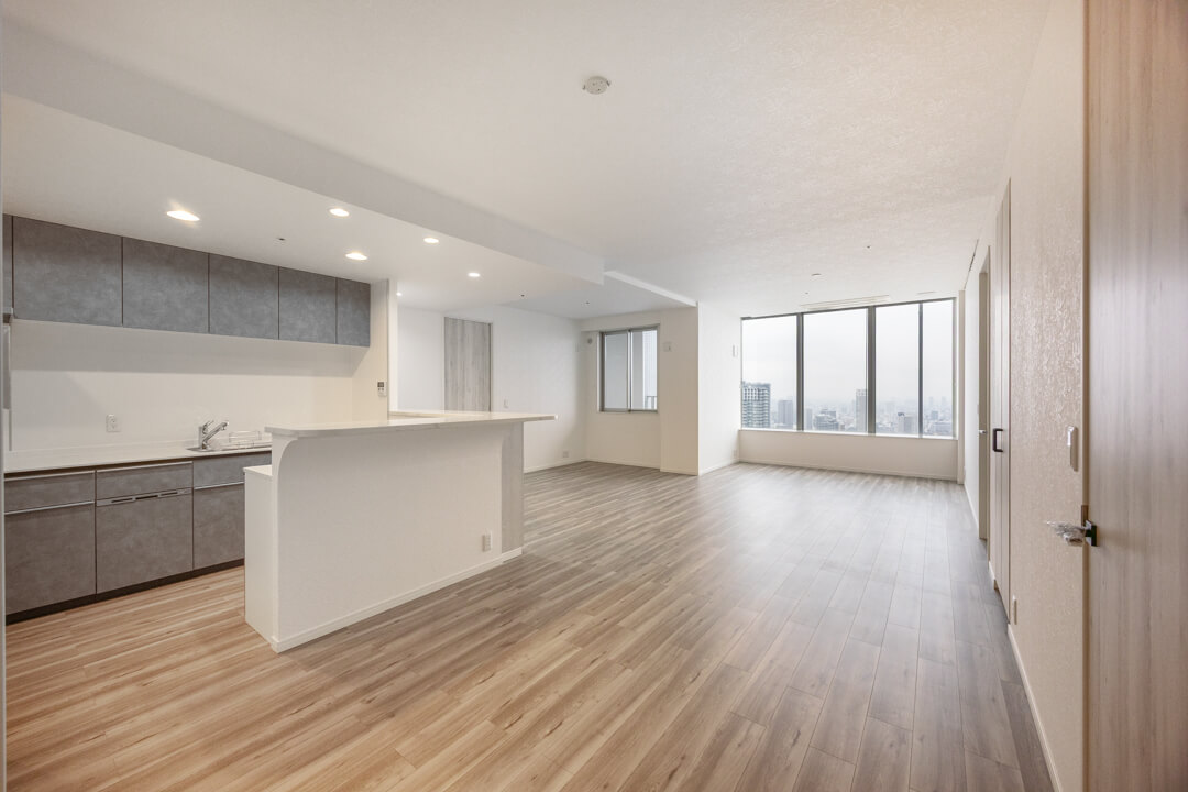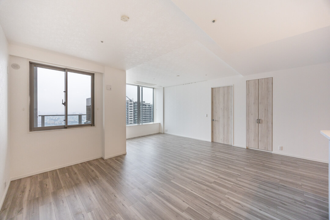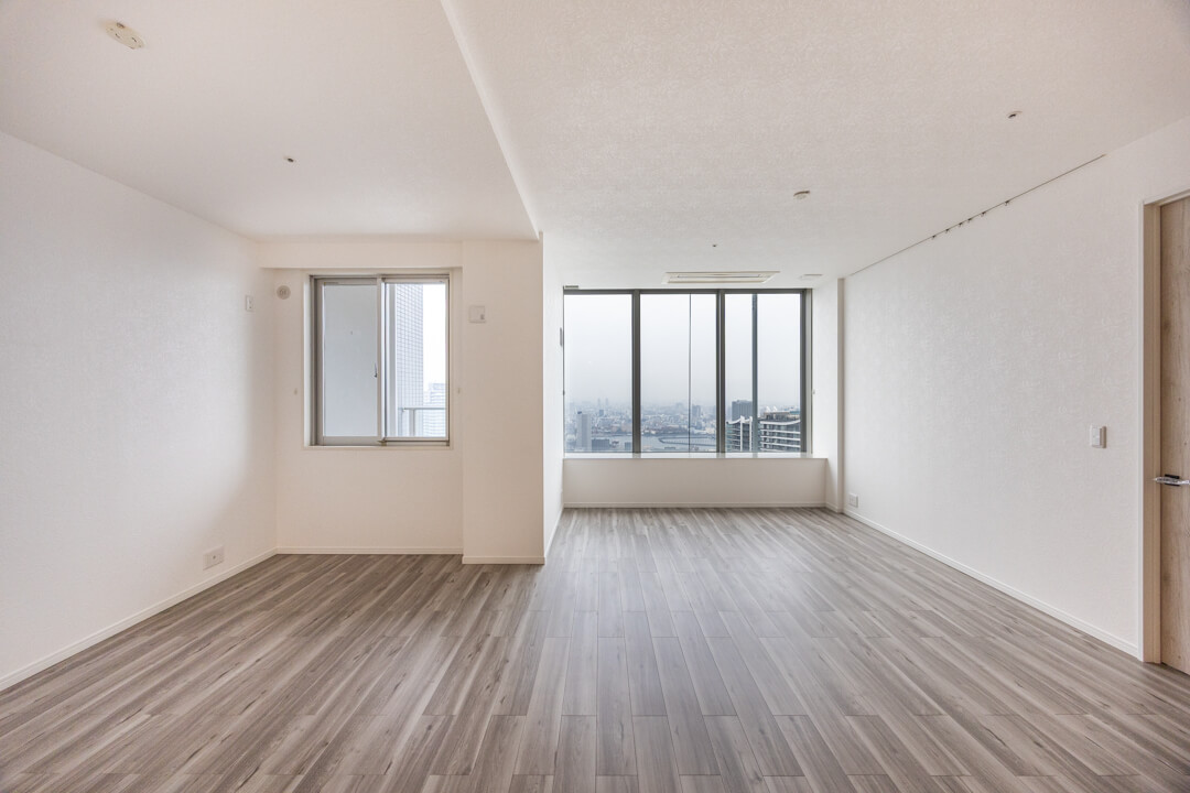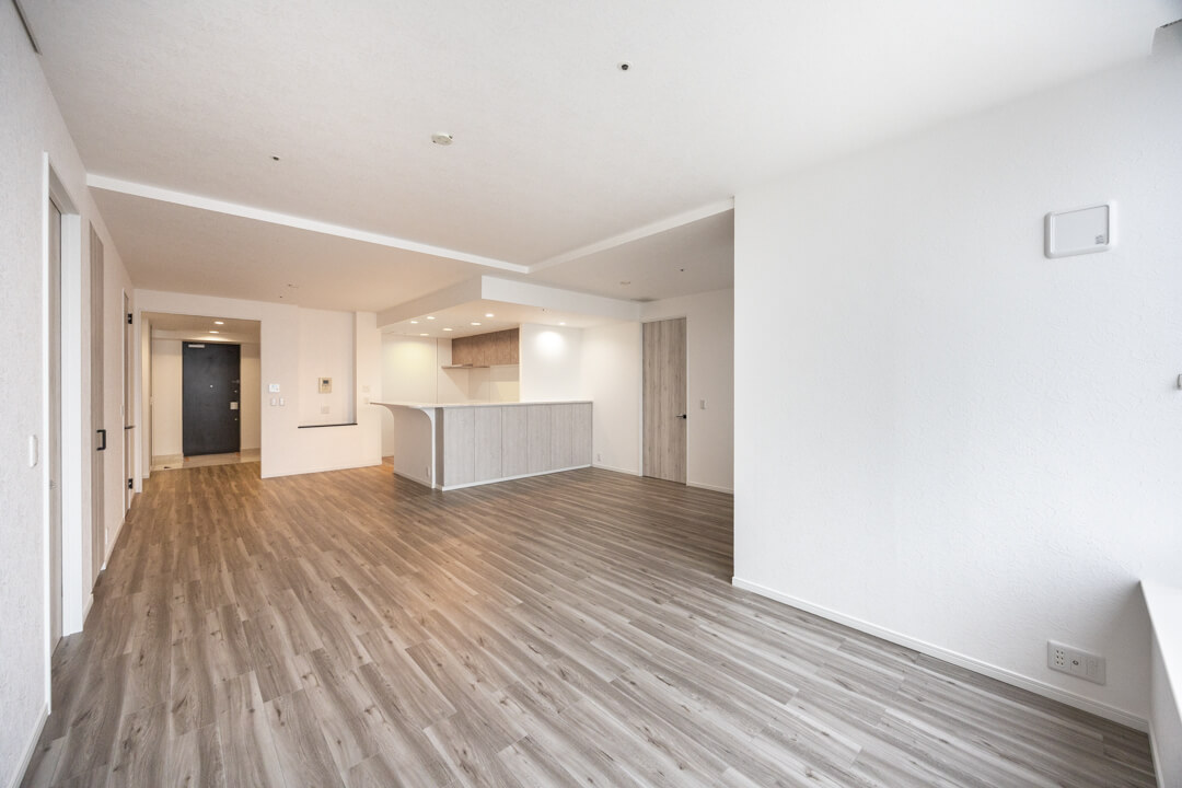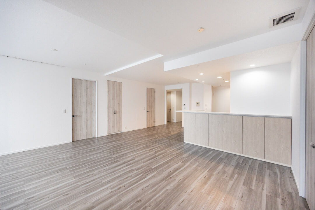 約23.7帖のリビングダイニングは、天井高最大約2.62mの開放感溢れる空間。窓からは遠くの大空や隅田川を望め、心地よい光と眺望に包まれます。白い壁紙に木目のフローリング&建具を組み合わせたナチュラルな内装は、どんなテイストの家具にも馴染みます。ピクチャーレールを活用すれば、お気に入りのアートや写真を手軽に飾ることもでき、個性あふれる空間づくりを楽しめそうです。