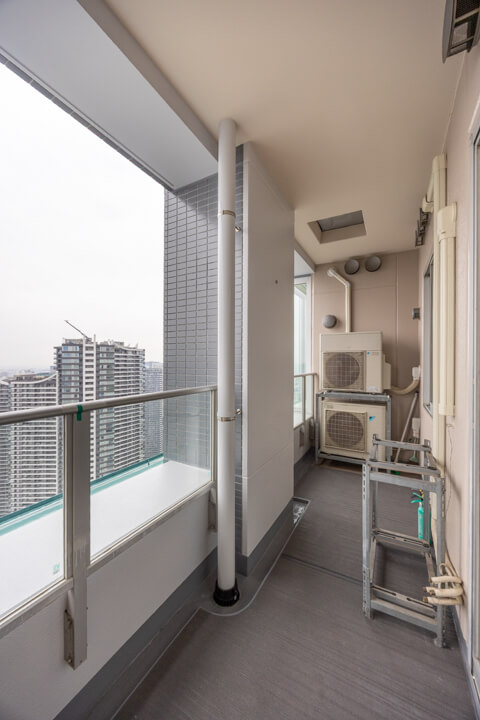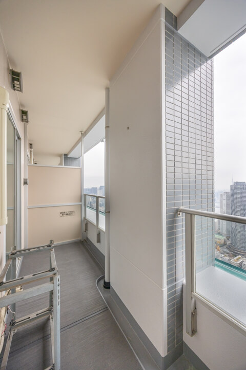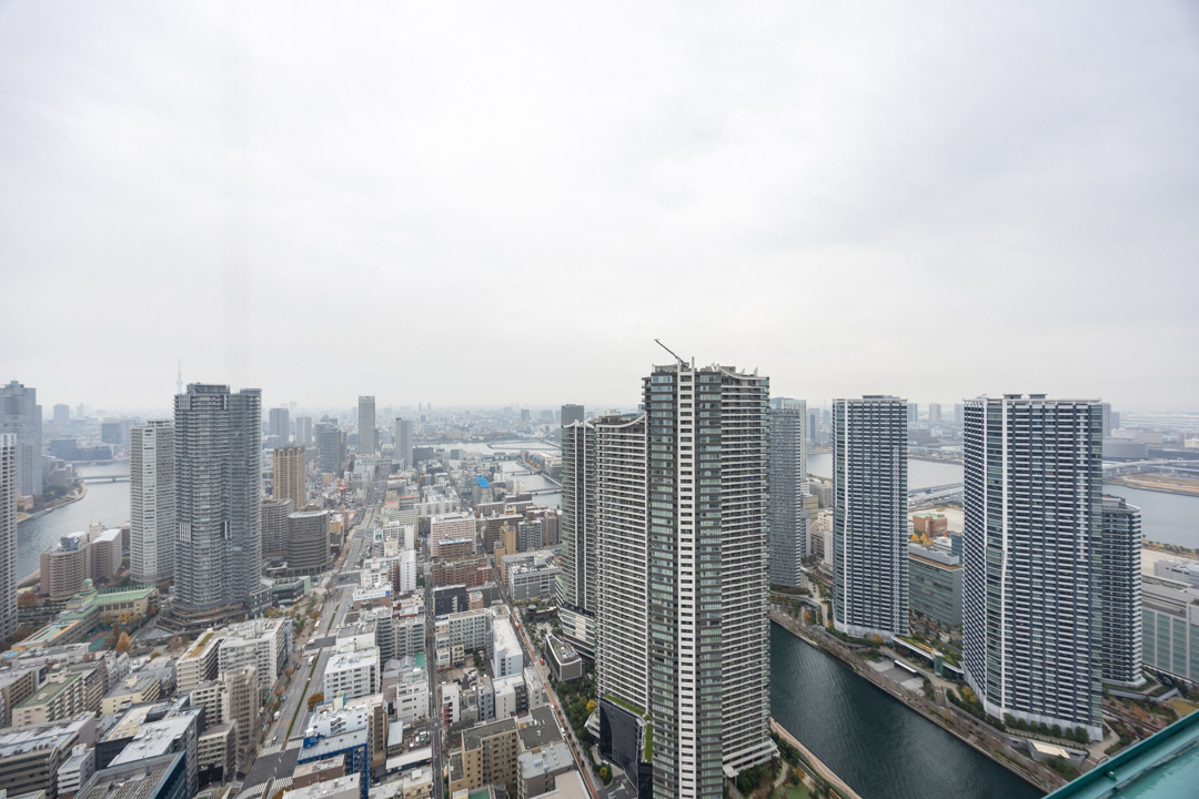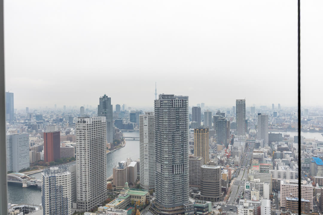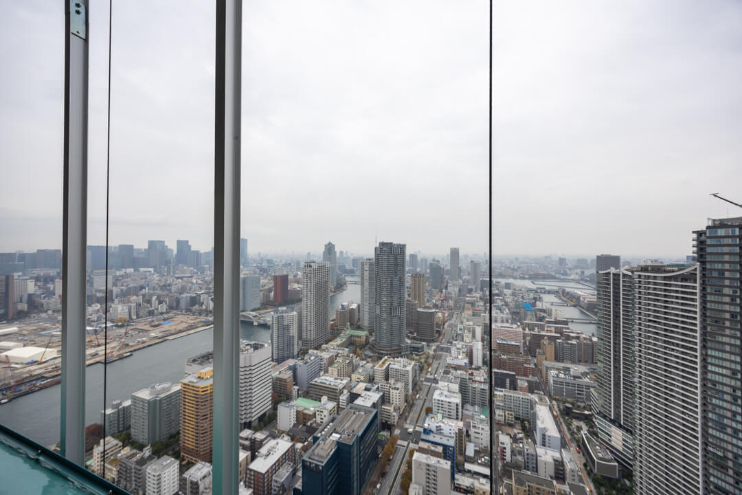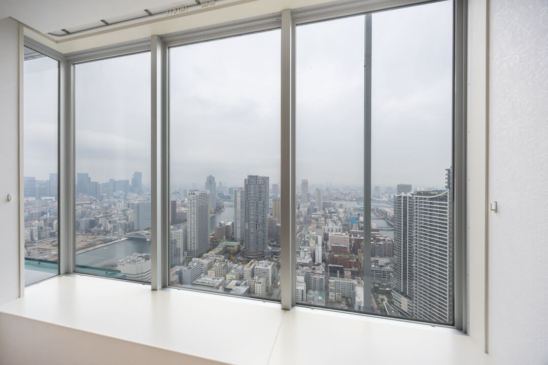 洋室2に接続するバルコニー。撮影日はあいにくのお天気でしたが、56階からの開放感溢れる眺望を堪能できます。隅田川を望む、抜けのある見晴らし。スカイツリーも見えました(※天候によります)。