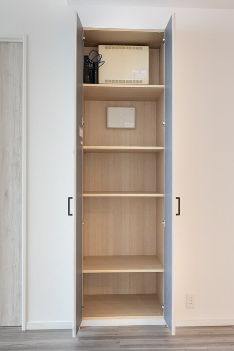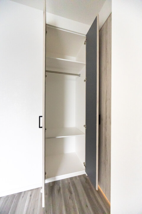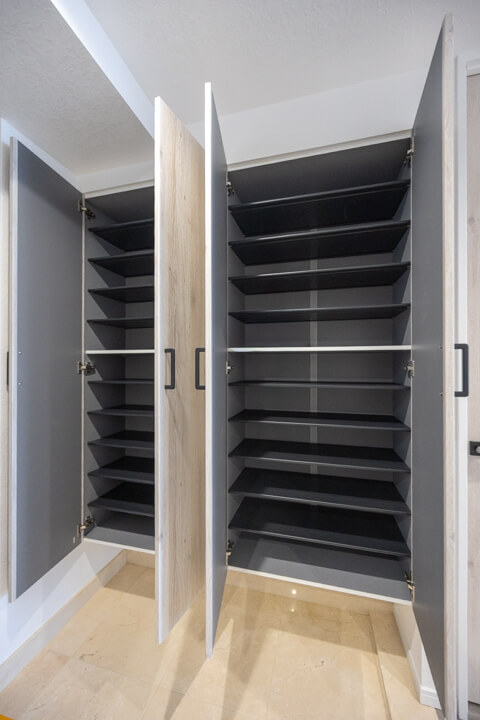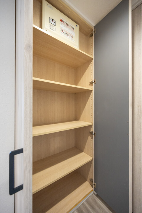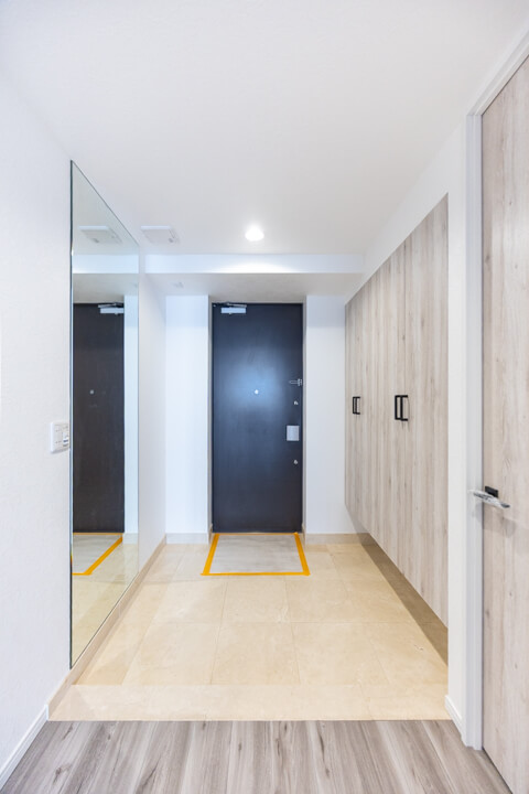 全身鏡付きで広々とした印象の玄関スペース。靴を履いた状態でコーディネートチェックができるのも嬉しいポイントです。対面側には大容量のシューズボックスを完備。自由度の高い可動棚で、ロングブーツやレインシューズもすっきり収納できます。廊下にも物入があり、日用品ストックや掃除用品の収納に重宝しそうです。