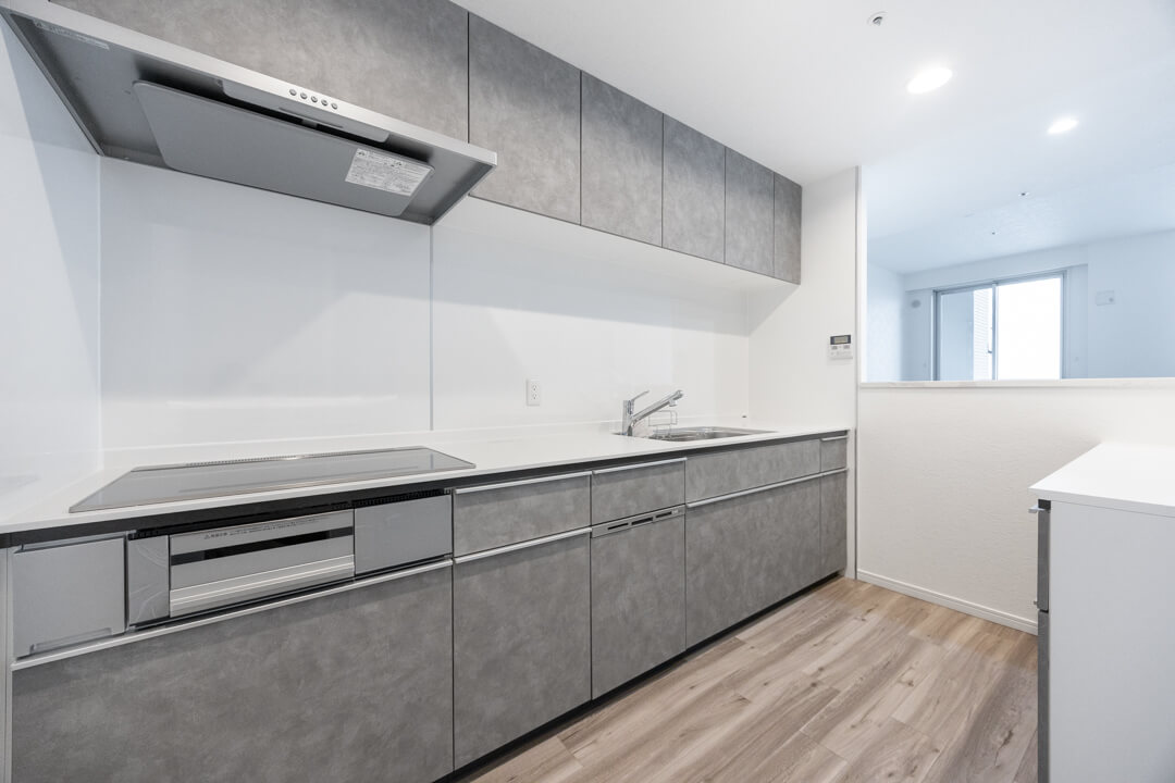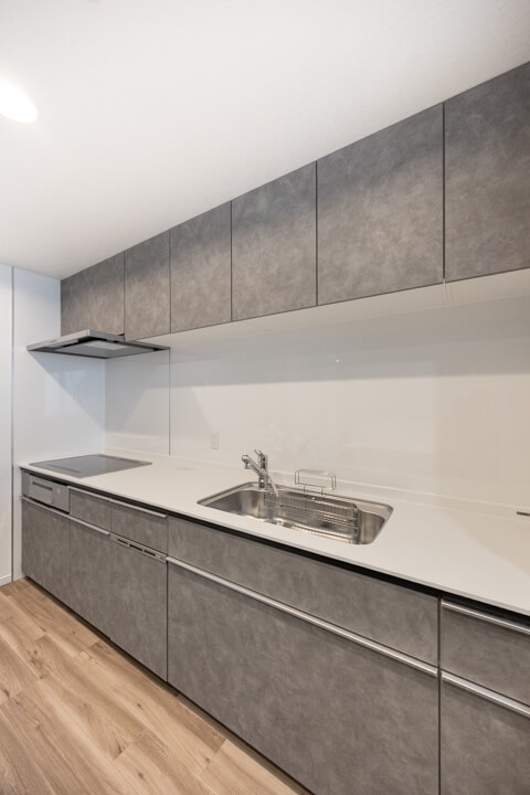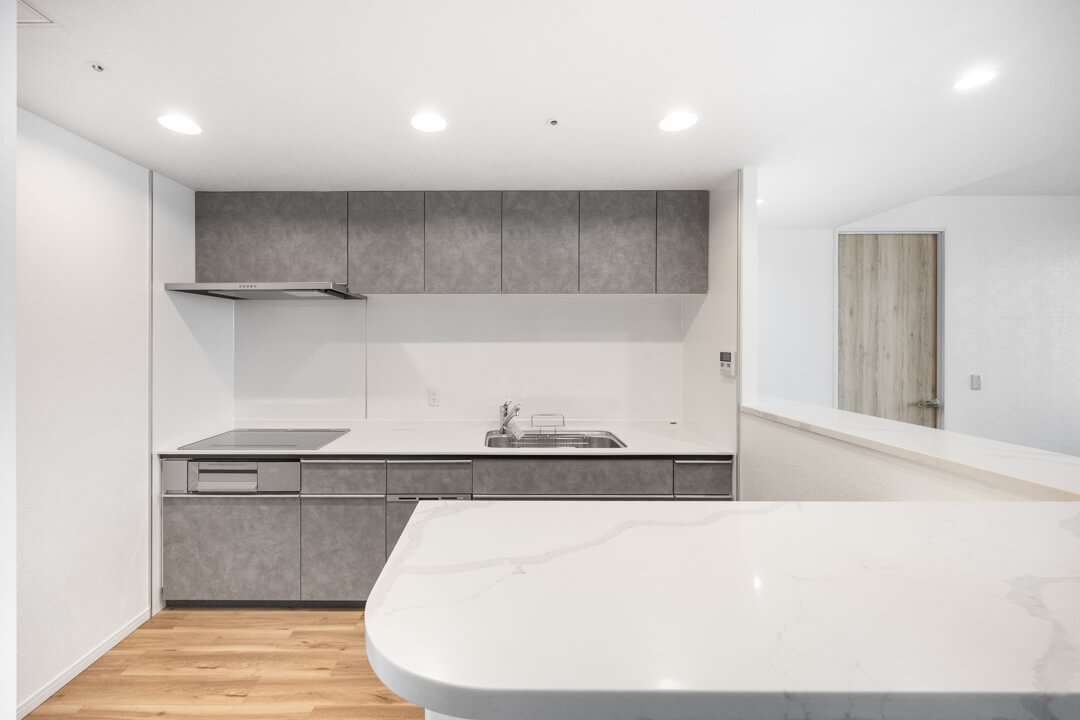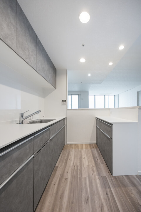 約4.4帖の広々としたキッチンスペース。腰壁で仕切られ、ほど良いこもり感のある空間です。調理に集中できそうですね。生活感が出る手元をさりげなく目隠しできるのもポイント。グレー基調のデザインがスタイリッシュな印象です。