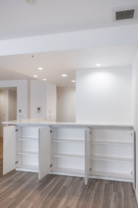 背面にはキッチンと同じデザインのカウンター収納を完備。リビング側も戸棚になっていて、収納性に優れています。カウンター部分は作業スペースとしても使えるので、複数人で調理をしたい時に活躍しそうです。