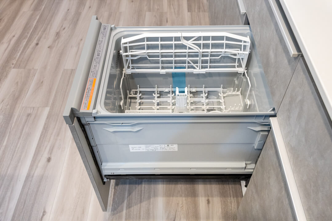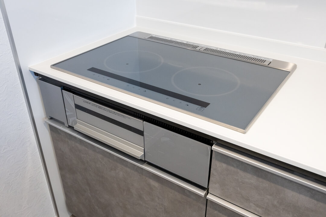 スイッチで火力を調節でき、ガスコンロよりも調整が簡単なIHクッキングヒーターを採用しています。凹凸がなくフラットなので掃除がしやすく、日々のお手入れがしやすいのも嬉しいポイントです。食洗機も内蔵されていて、後片付けの時短が叶います。