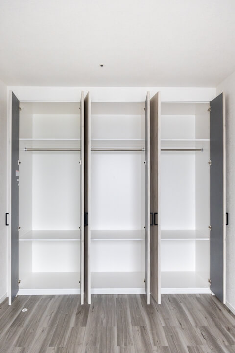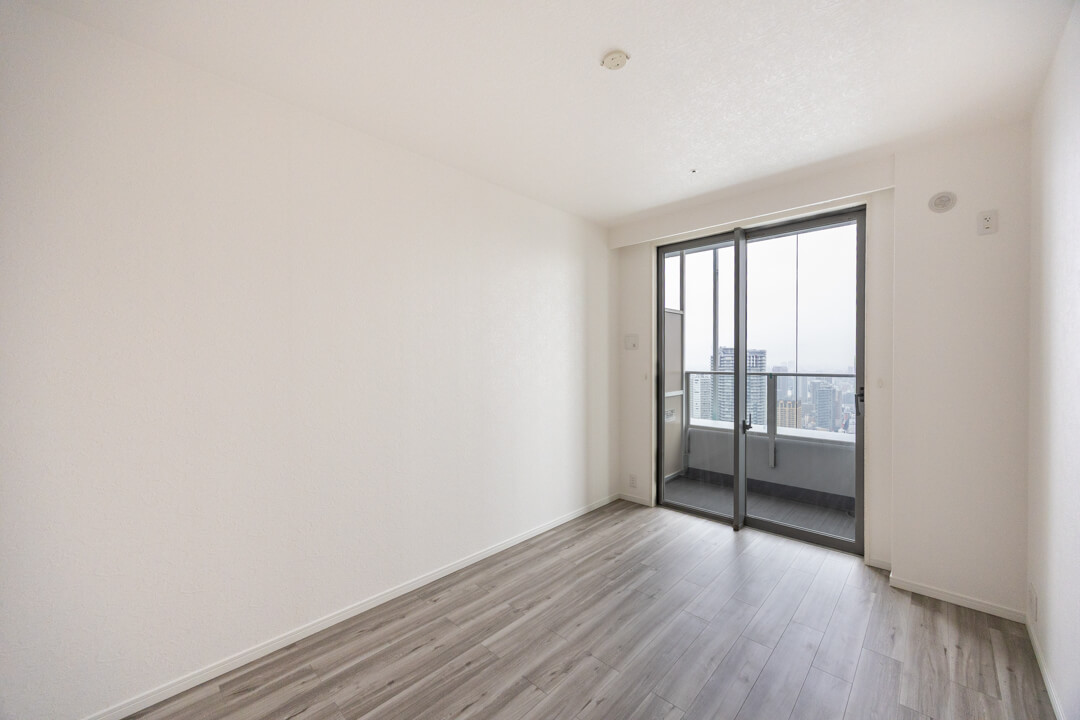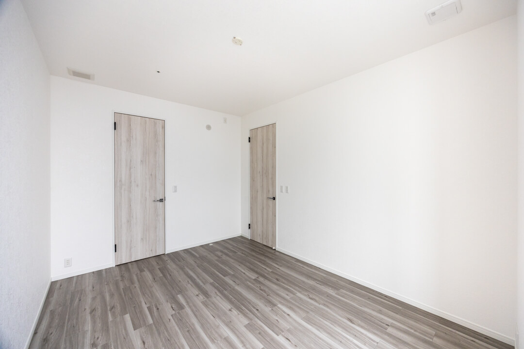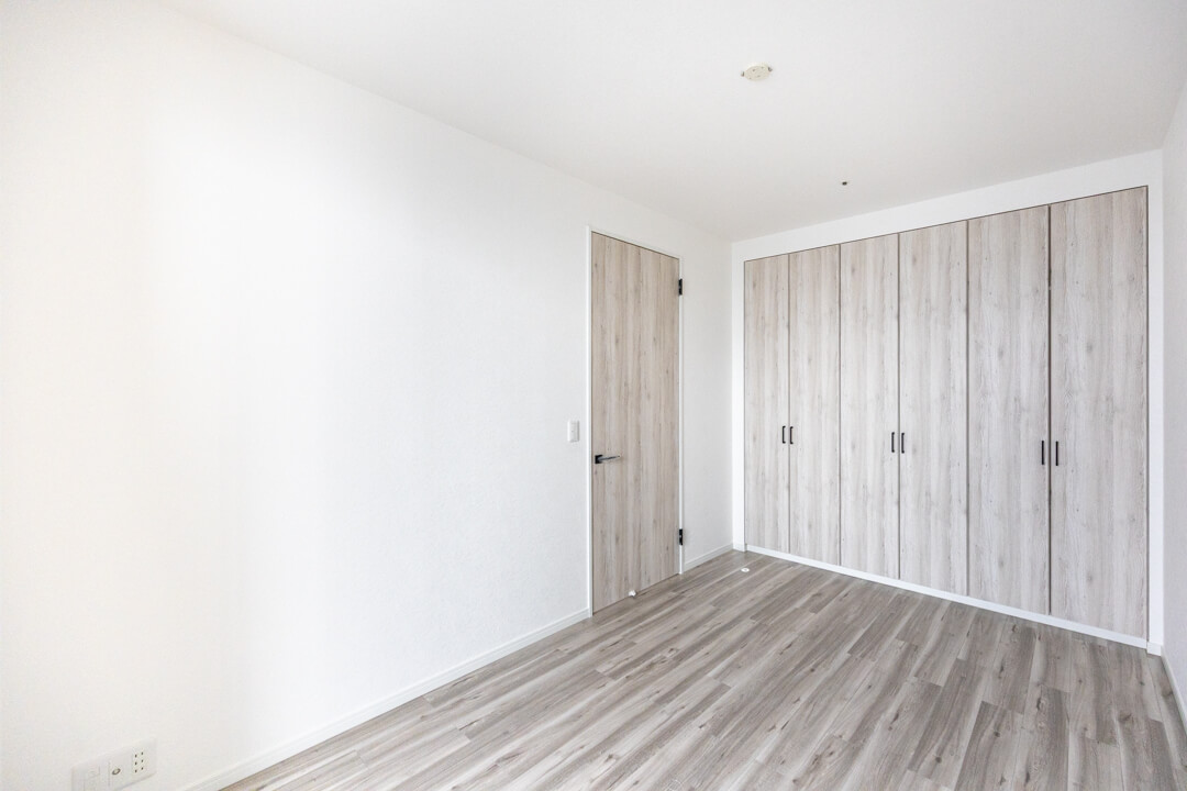 約6.5帖の洋室2。バルコニー付きで奥行きを感じる空間です。梁や柱のないすっきりとした空間で、家具レイアウトの幅が広がりそう。壁いっぱいにクローゼットが並び、収納スペースも充実しています。子ども部屋にいかがでしょうか?