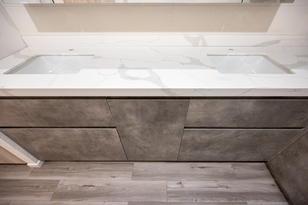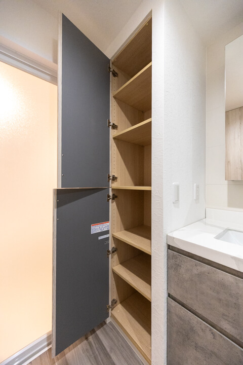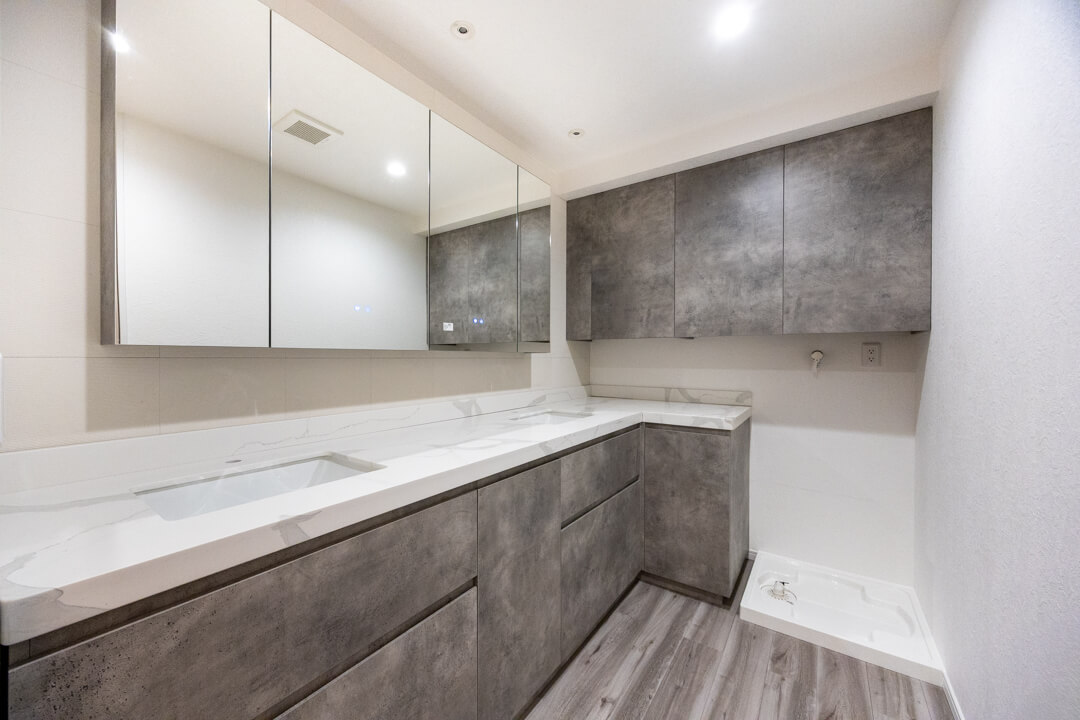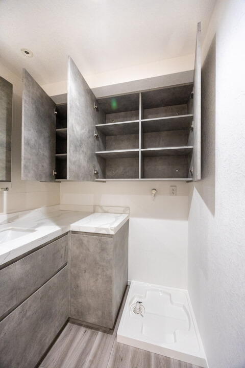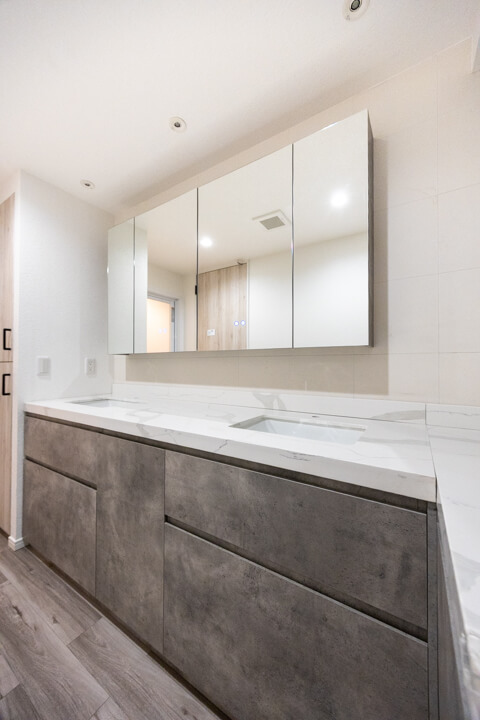 ホテルライクな2ボウルタイプの洗面化粧台。2人並んで使用でき、忙しい朝の身支度もスムーズに行えそうです。洗面台本体の収納に加え、吊戸棚やリネン庫も設置されていて、豊富な収納が魅力的。洗面まわりの小物からタオル・パジャマ類までたっぷり収納でき、いつも清潔な洗面室をキープできそうです。