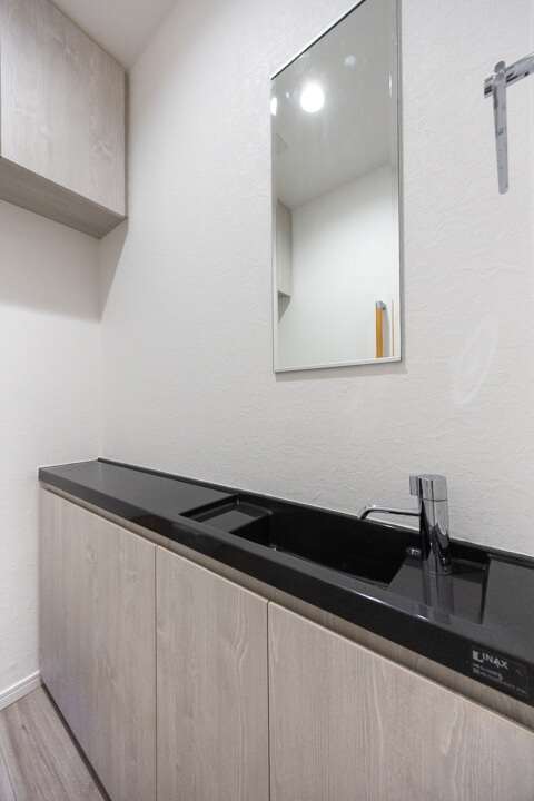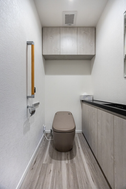 廊下に面していて独立性の高いレストルーム。グレイッシュなブラウンカラーが印象的なトイレを採用しています。タンクレス仕様ですっきりとした印象ですね。手洗いカウンターが設置されているのですぐに手を洗うことができ、ゲストを洗面室まで案内する手間がかからないのも◎。大容量の吊戸棚完備で、トイレットペーパーや掃除用品の収納に便利です。
