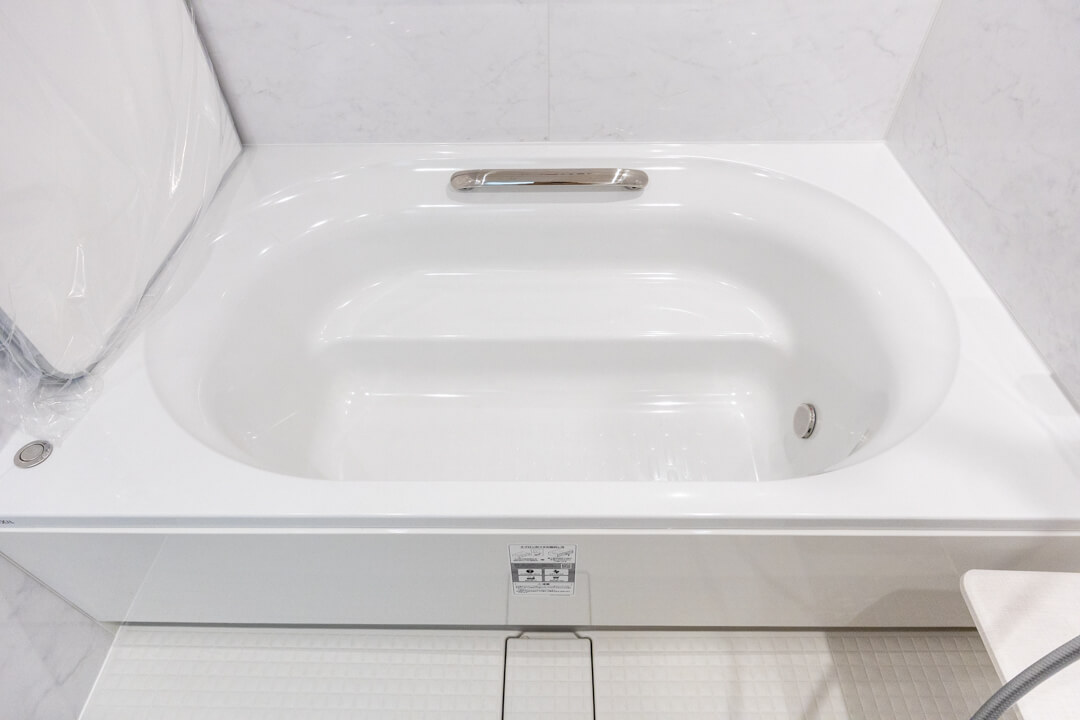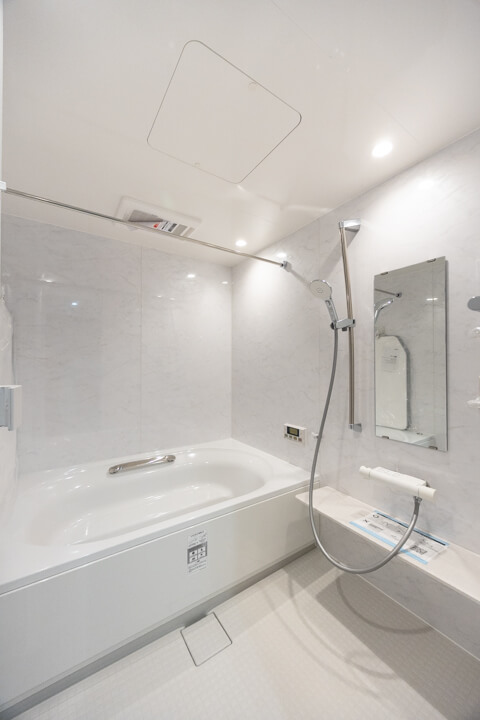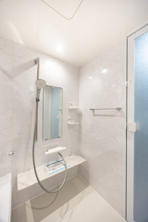 明るい内装で清潔感のあるバスルーム。ゆったり入浴できる1620サイズです。浴室換気乾燥暖房機・追い焚き機能搭載で1年中快適なバスタイムに。浴槽にはベンチが付いていて、半身浴に便利です。