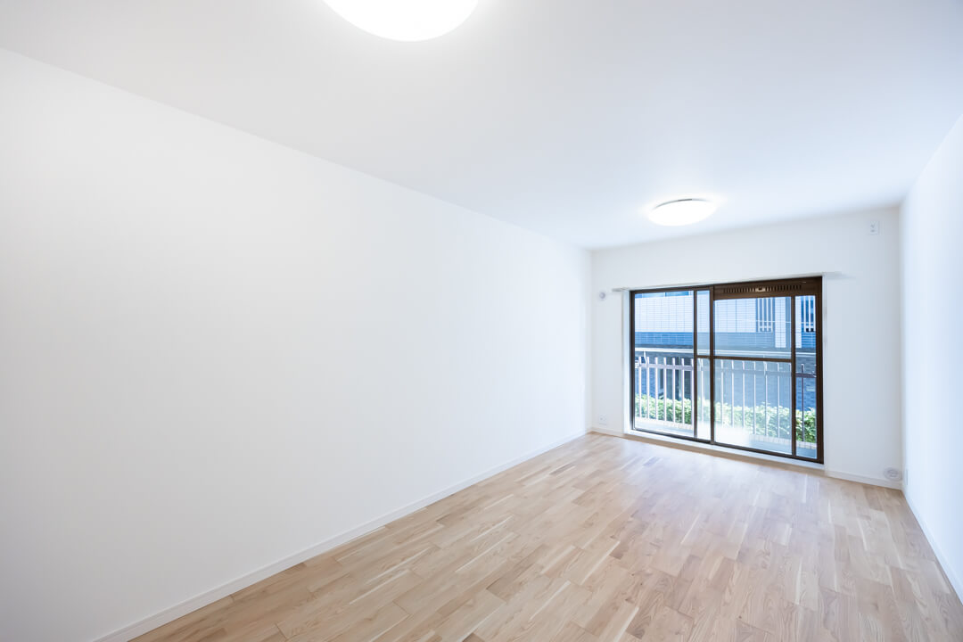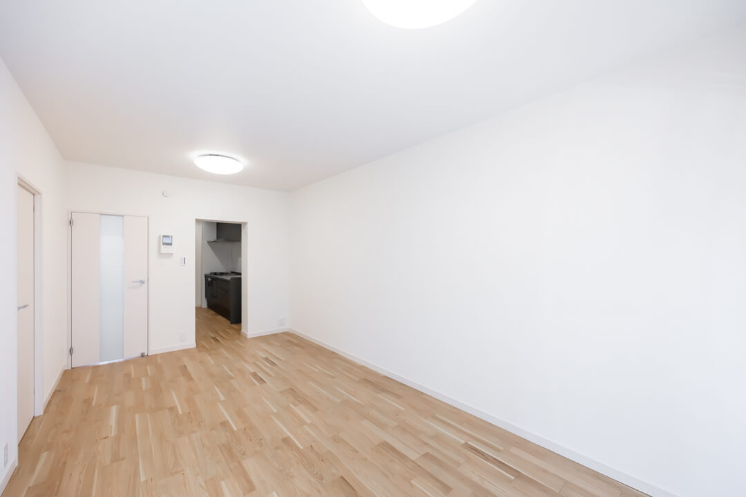 約14.5帖の広々としたリビングダイニングキッチンです。南東向きのため日当たりが良好で、マンション特有の大きな梁が無いため家具のレイアウトがしやすくなっています。
