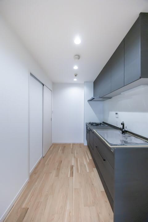 キッチンは、生活感が出やすいキッチンまわりをさりげなく目隠しすることができる独立キッチンです。また、リビングダイニングからだけでなく、廊下からも出入りができる便利な動線になっています。