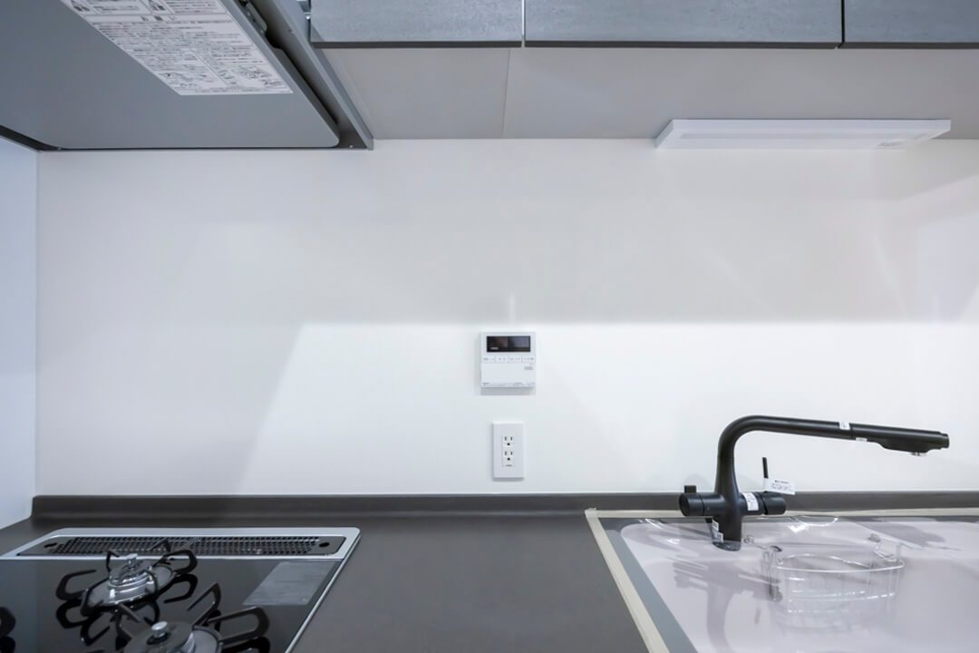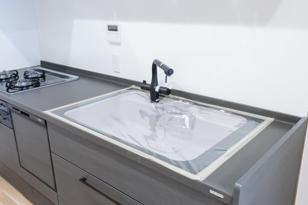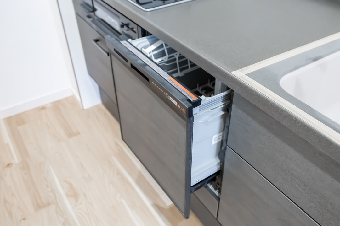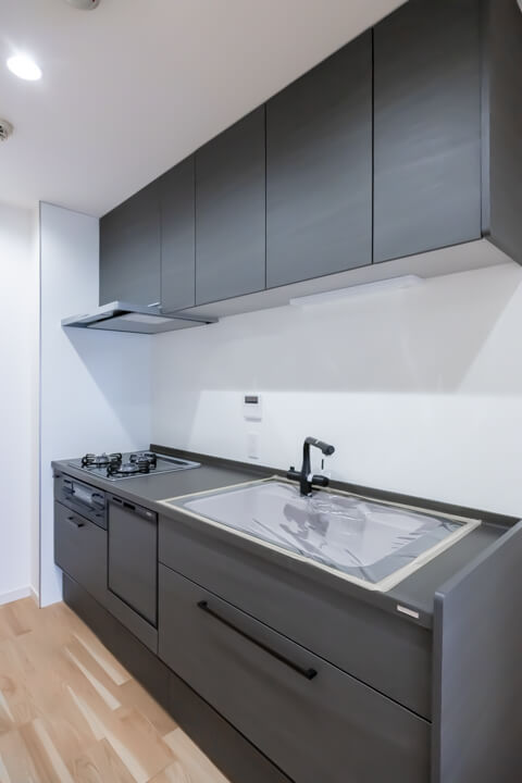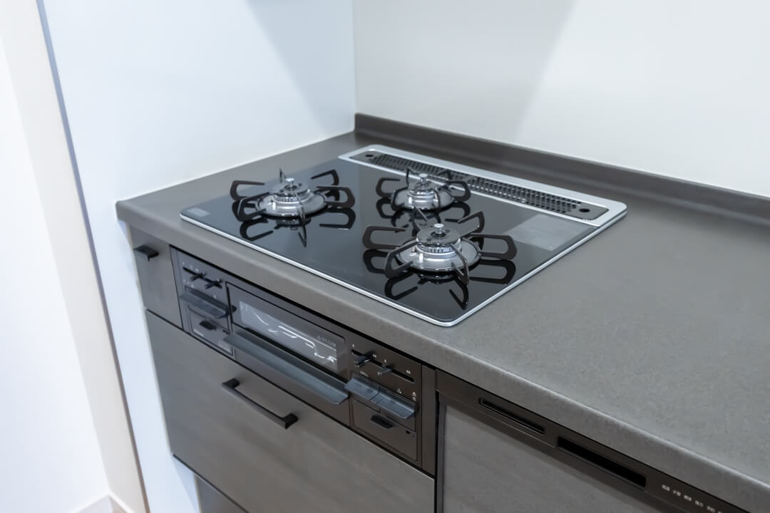 3口コンロ、グリル、食洗機付きと設備面も充実しています。シンクも広々としているので野菜などが洗いやすそうですよ。