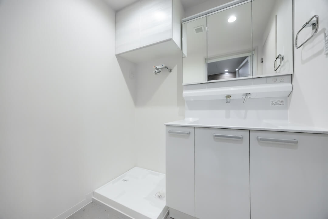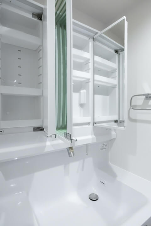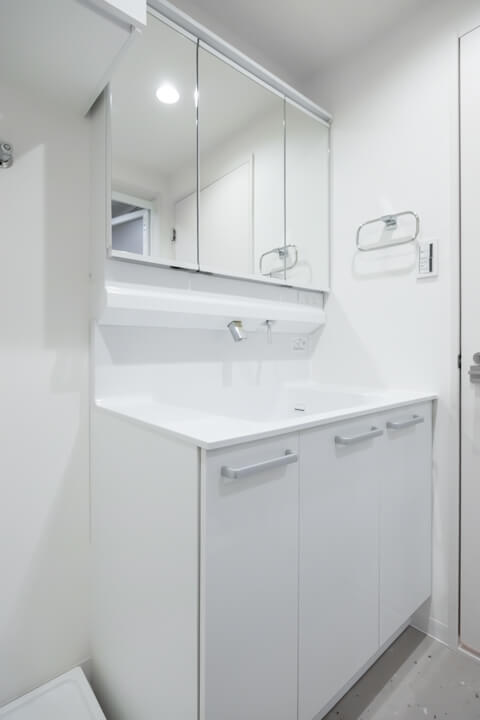 清潔感のある洗面化粧台は、三面鏡の中には化粧品などが収納できて使い勝手が良好。洗面ボウルとカウンターには継ぎ目が無いため、お手入れも簡単です。さらに、水栓が下向きに設置されているので、水が溜まりにくくて◎。