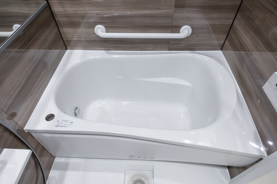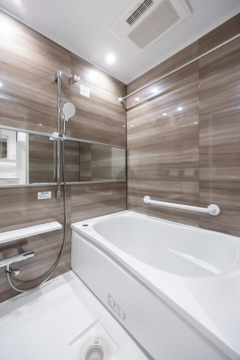 ブラウンの壁パネルが落ち着いた雰囲気を演出してくれている浴室です。お風呂にゆっくり浸かるのが好きという方に嬉しい追い焚き機能を搭載。家族の入浴時間がずれてしまっても安心です。また、浴室乾燥機には暖房・乾燥・換気・涼風の機能がついており、一年中快適に過ごすことができます。