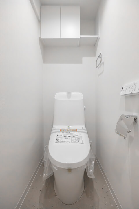 ウォシュレット一体型のトイレです。上部には吊戸棚が設置されているので、トイレットペーパーや掃除用具などを収納することができますよ。