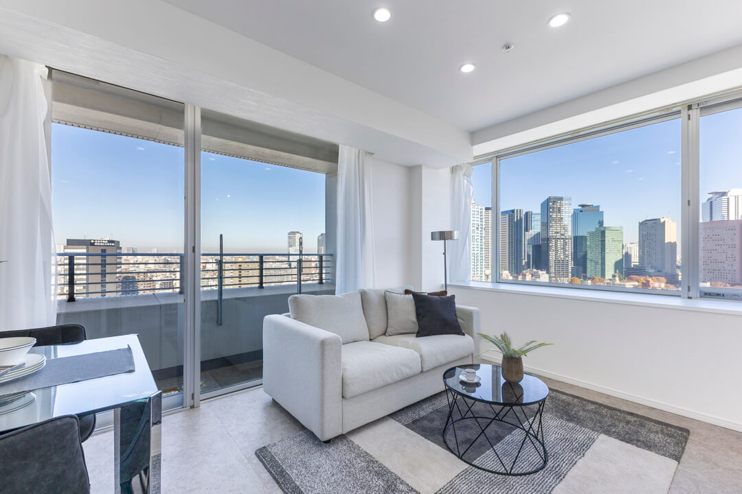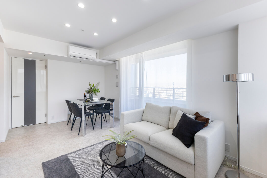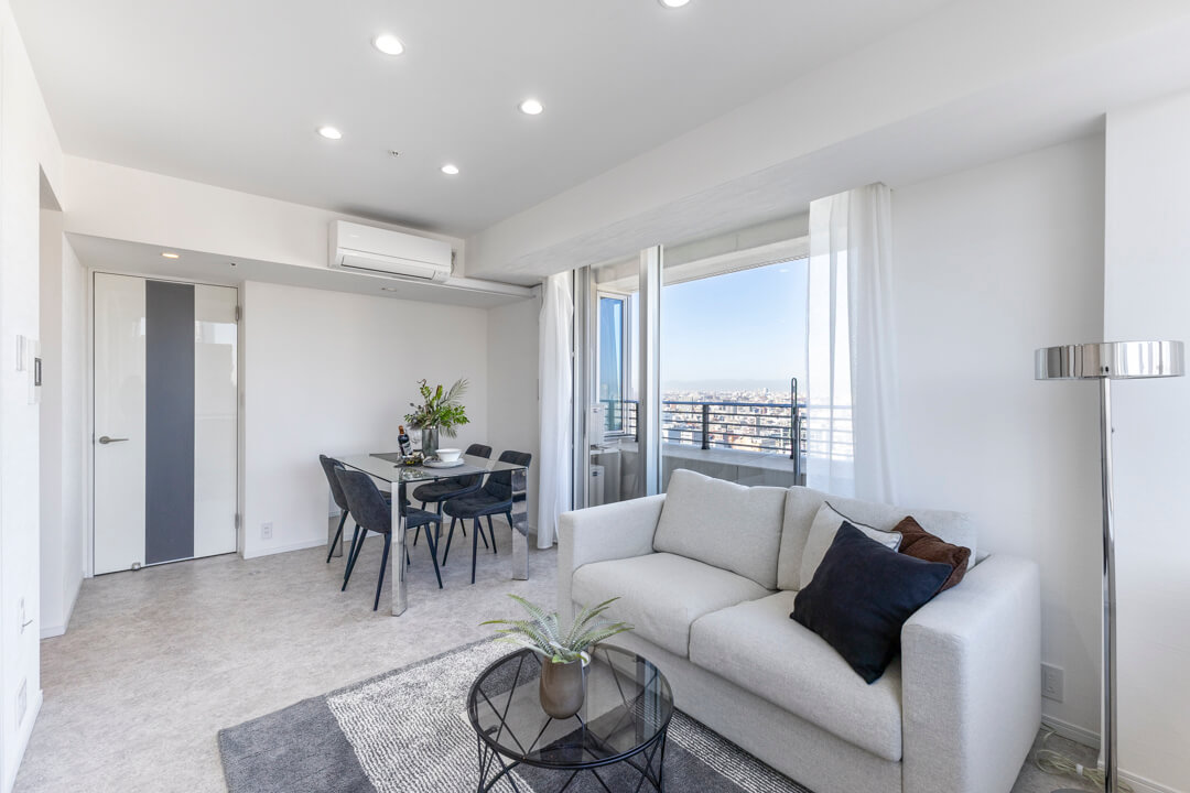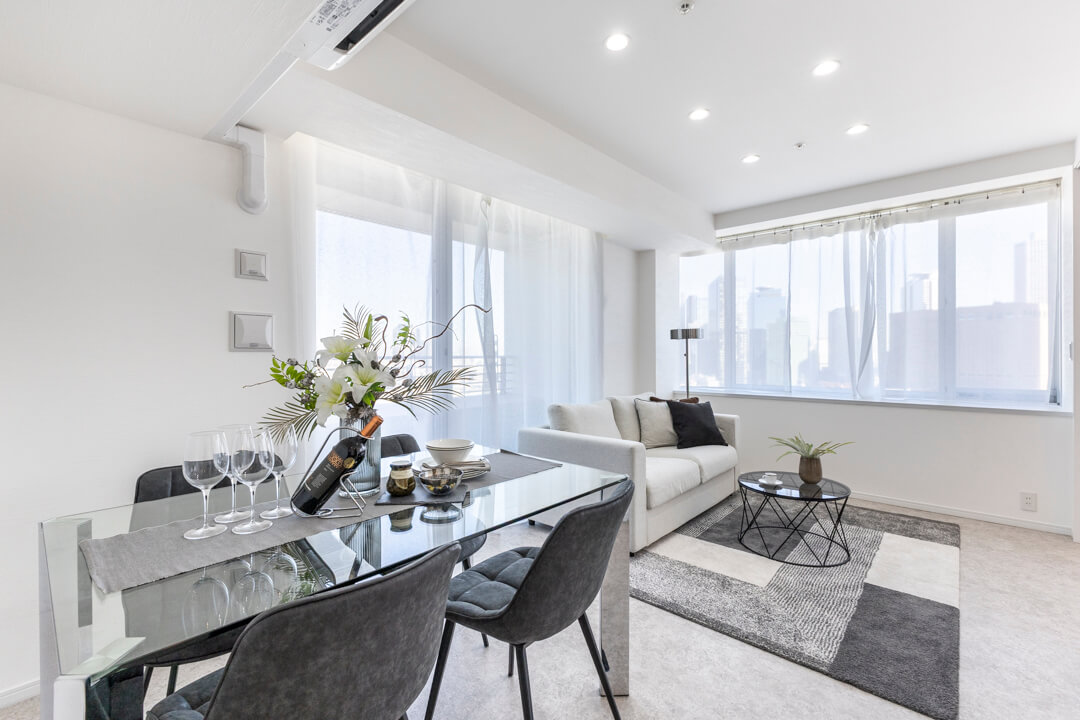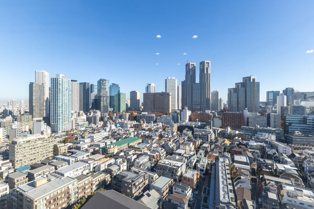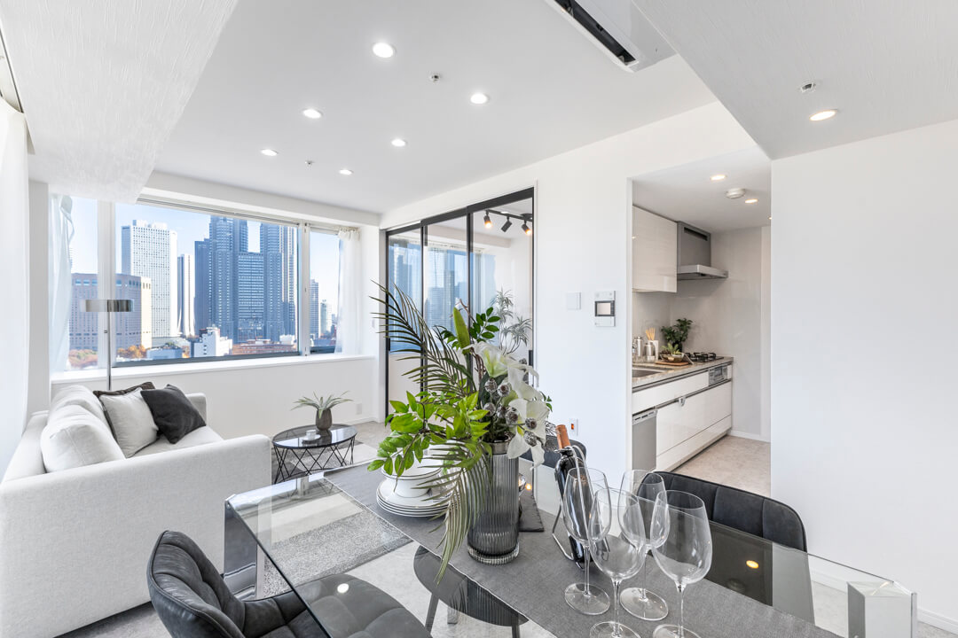 約10.7帖のリビングダイニング。二面採光で開放感たっぷり。青い空と新宿エリアのビル群が望めます。また、隣接する洋室と繋げて広々と過ごすことも可能。ライフスタイルに合わせて様々な使い方ができます。キッチンスペースは空間分けされていて、生活感を感じさせないすっきりとした印象も◎。