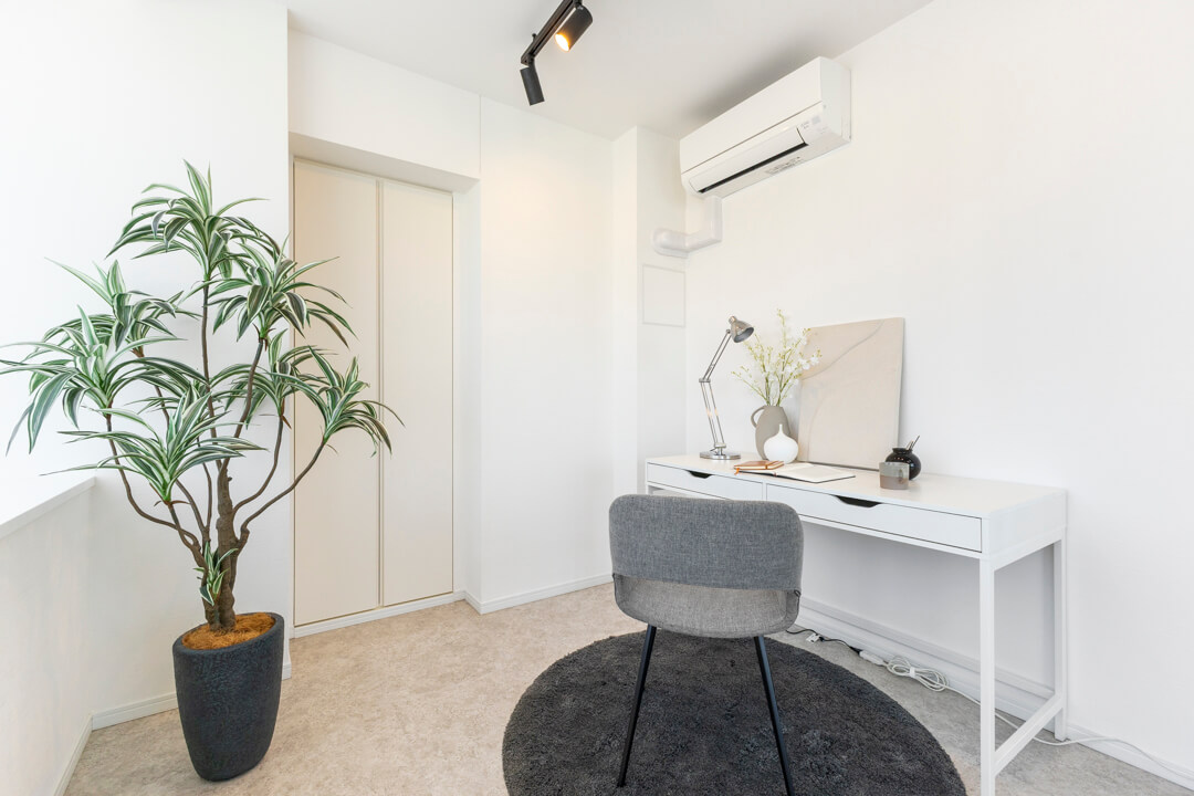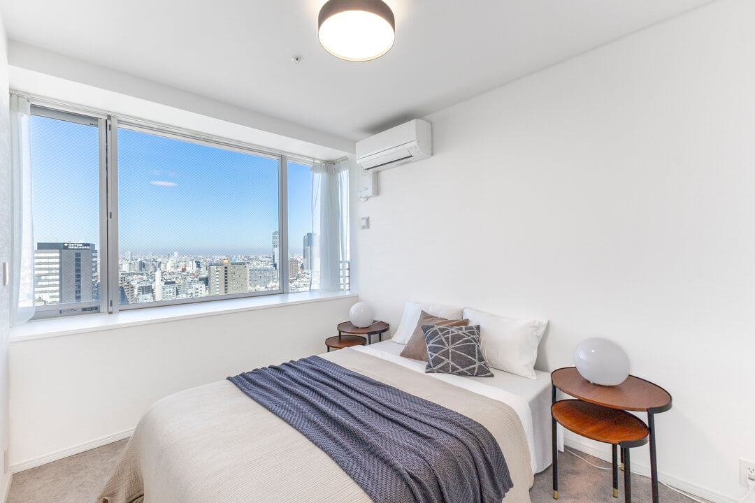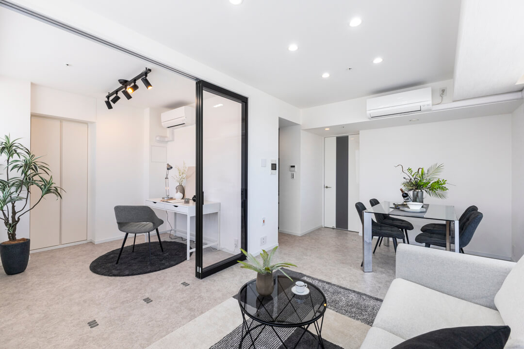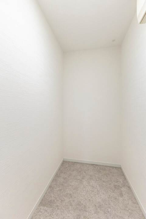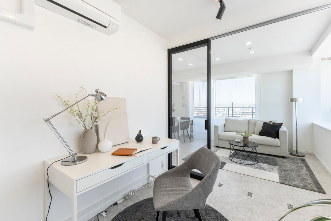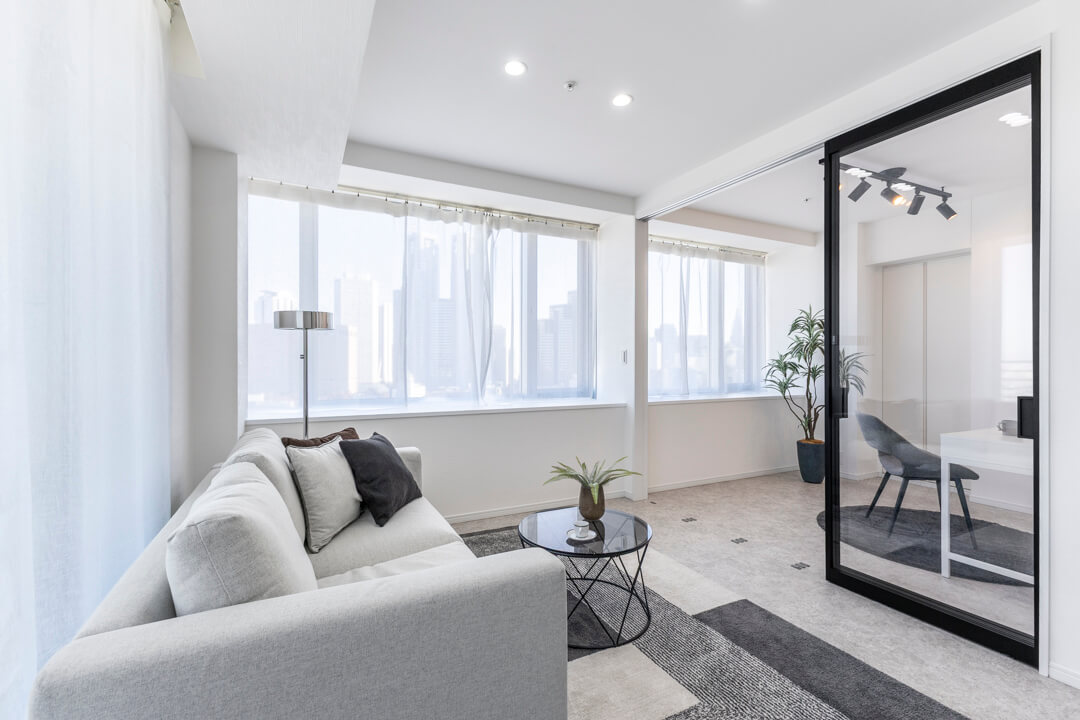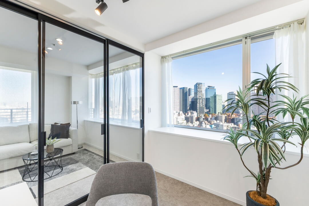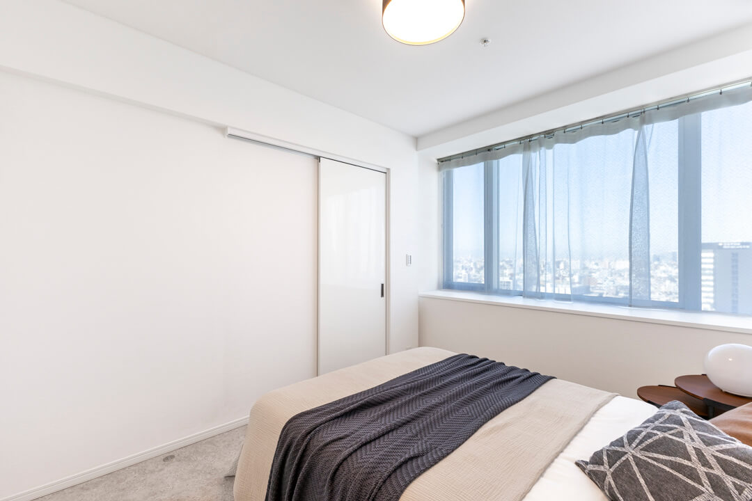リビングダイニングと隣接した約5.0帖の洋室。開放感のある透明の引き戸を採用しており、扉を閉めた状態でも窮屈感なく過ごせます。窓も大きく眺望も良好。新宿エリアのビル群が見渡せます。ワークスペースや趣味部屋としても使いやすいお部屋。クローゼットも備わっています。