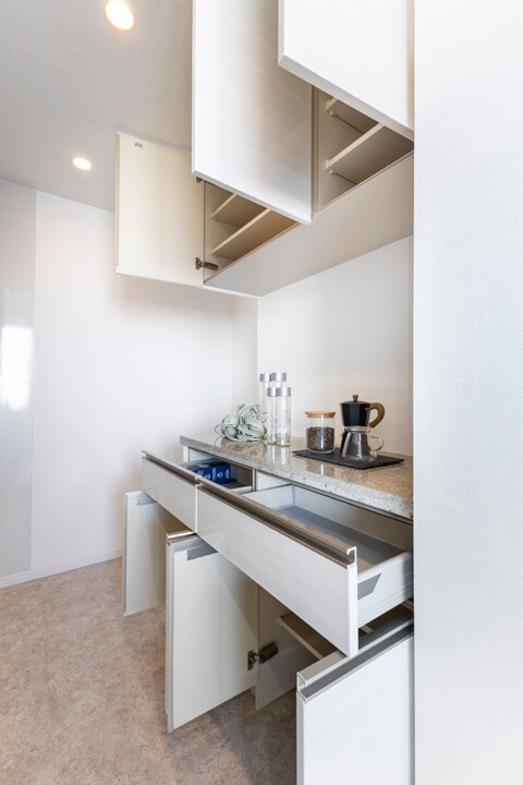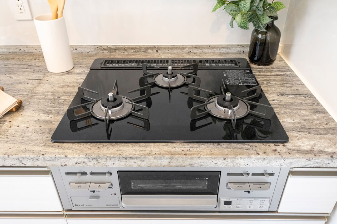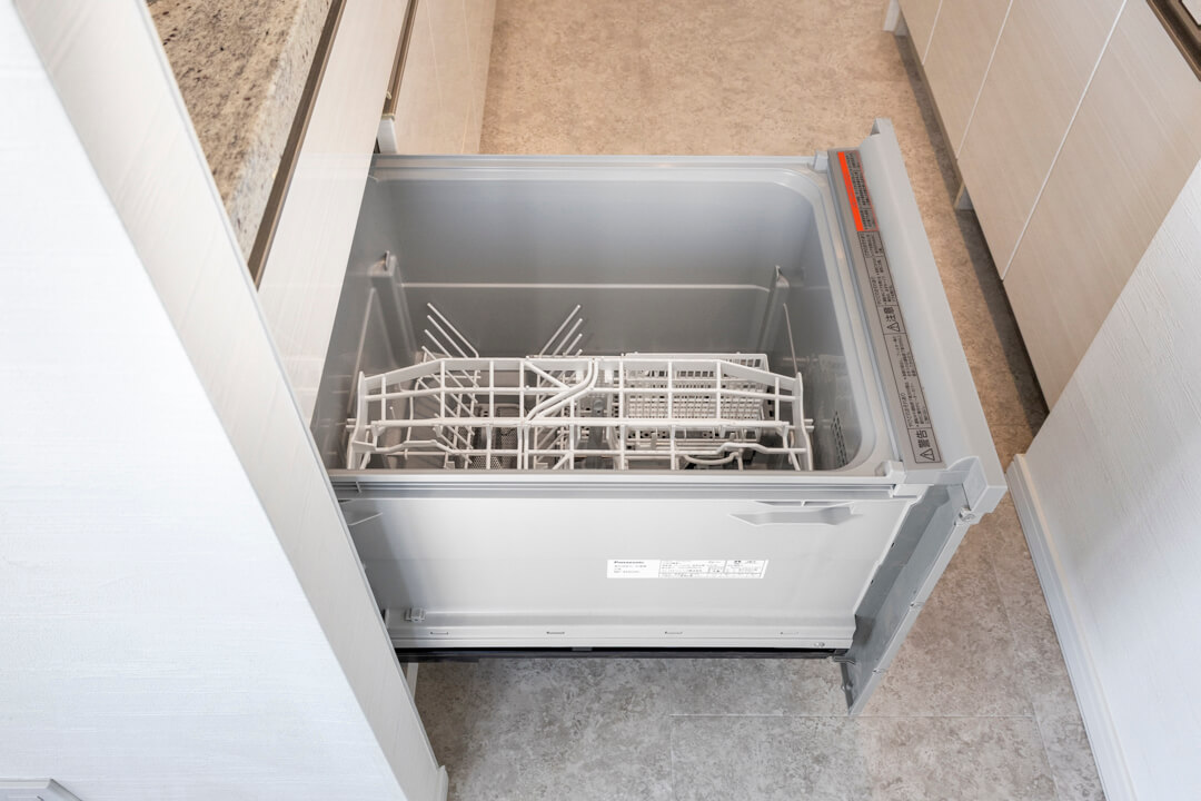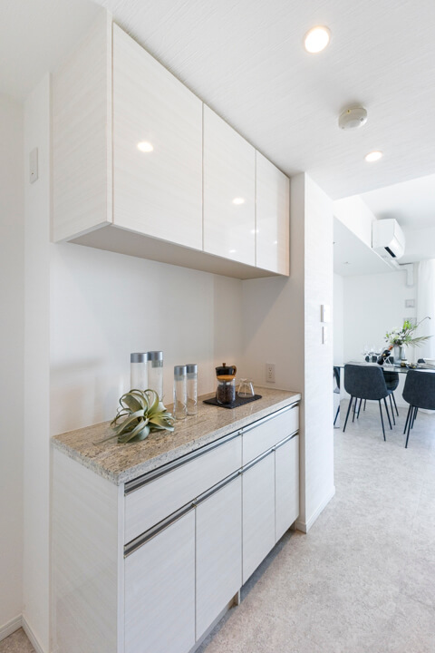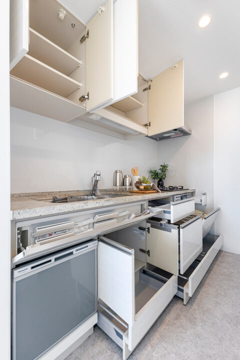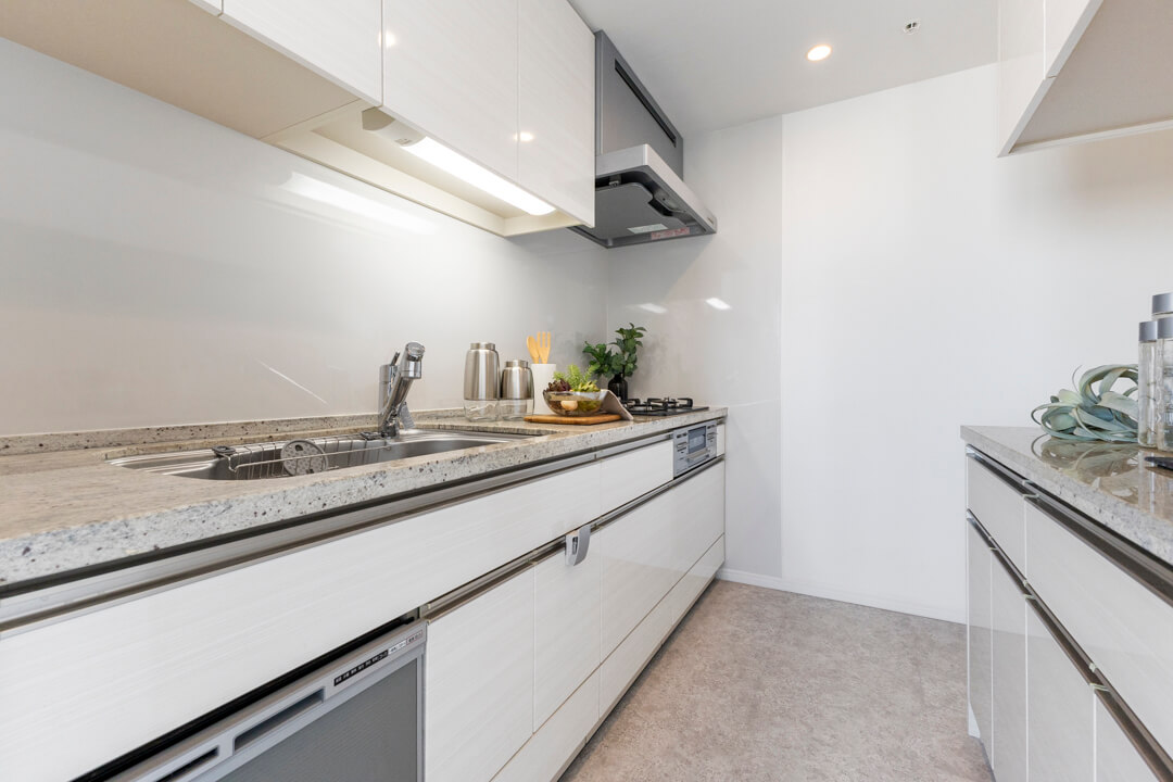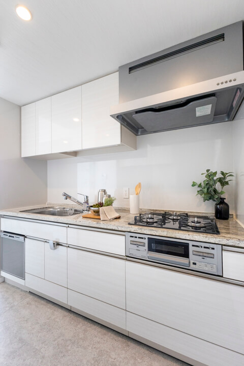 約2.7帖のキッチンスペース。リビングダイニングと空間分けされていて、キッチンまわりの生活感をさりげなく目隠しできます。料理が捗る3口ガスコンロ、家事の時短に心強い食洗機、生ゴミの処理に便利なディスポーザー付きで設備も充実。カップボード付きで収納スペースがしっかりと確保されています。