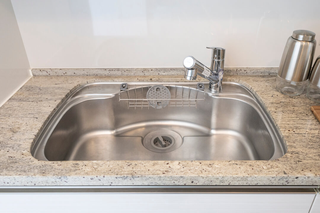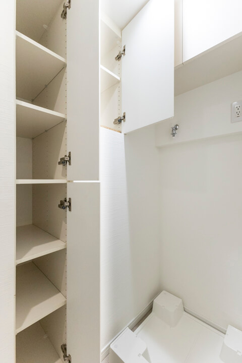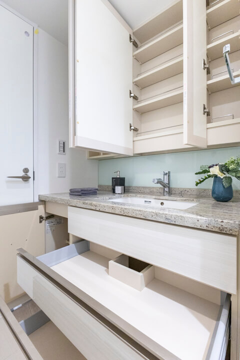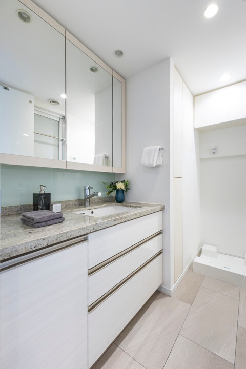 天然石調のカウンターでホテルライクな上質な雰囲気が漂う洗面化粧台。洗面まわりの小物がすっきり整頓できるミラーボックスや、物の出し入れがしやすい引き出しキャビネット付きで使い勝手の良さもポイントです。別途リネン庫も備わっていて、収納スペースが充実しています。