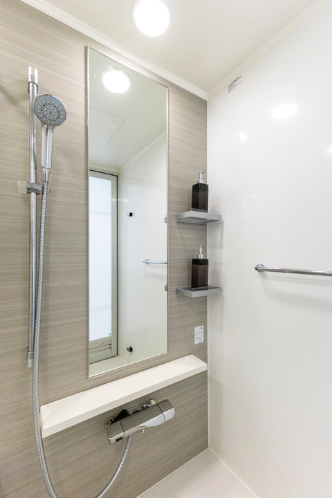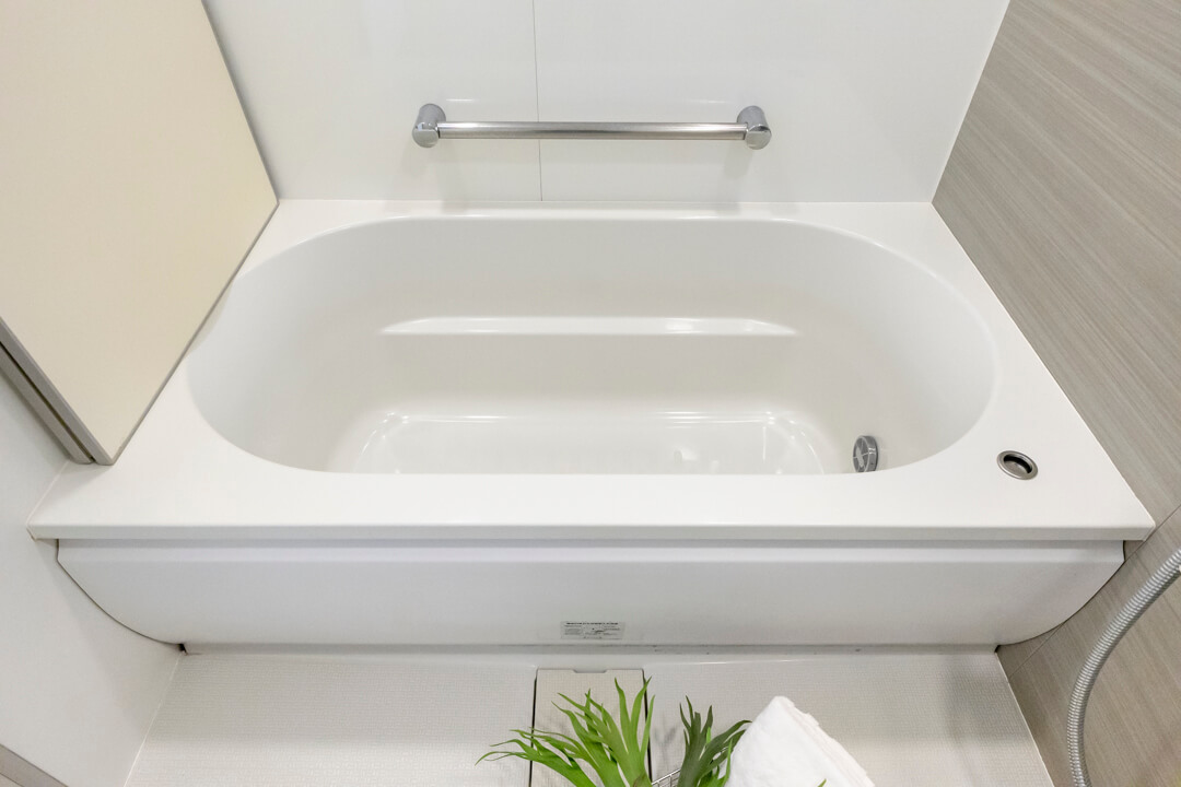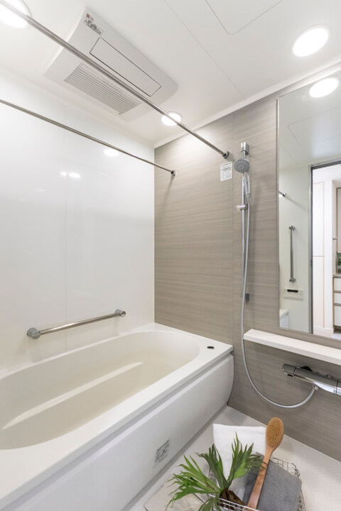 1418サイズのバスルーム。追い炊き機能の他、乾燥・換気・暖房・涼風の4つの機能が備わっていて、一年中快適にバスタイムが楽しめます。ランドリーパイプも2本付いていて、雨の日や冬場の洗濯にも困りません。