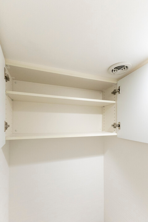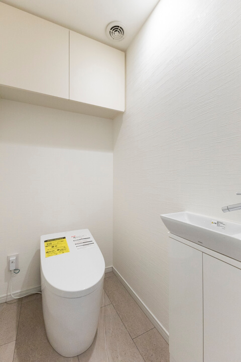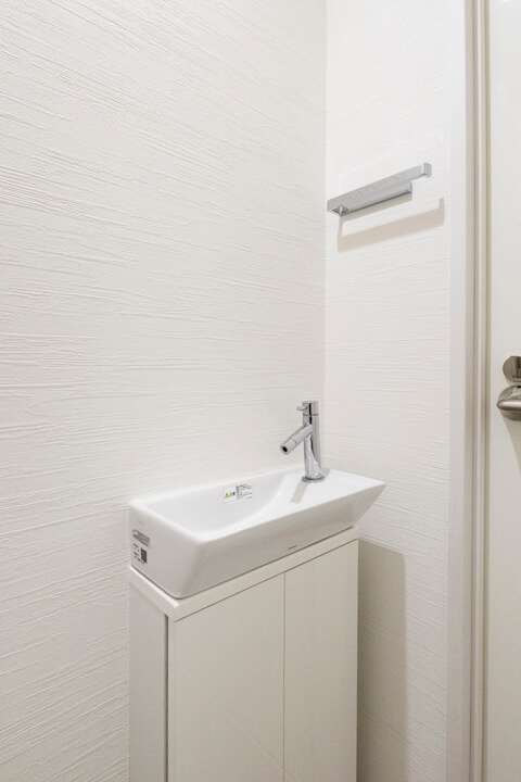廊下に面したレストルーム。空間がすっきり見えるタンクレストイレです。独立型の手洗い器、収納スペースも備わっています。