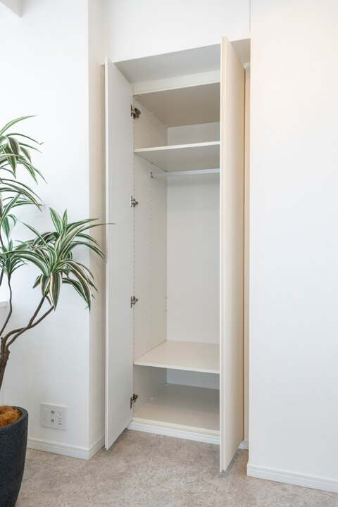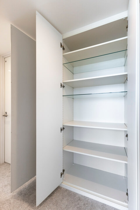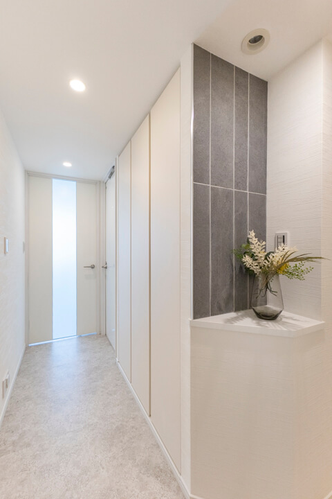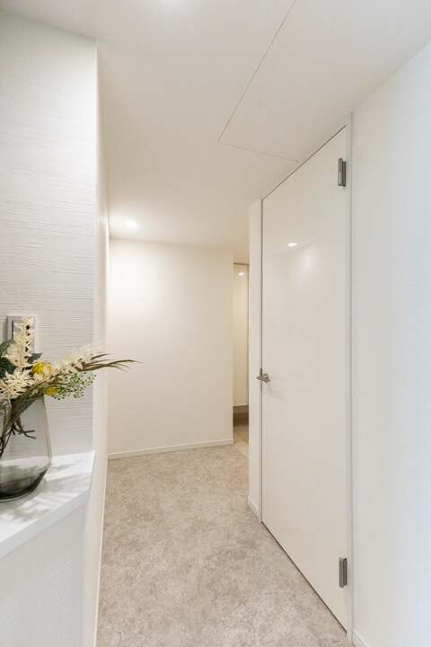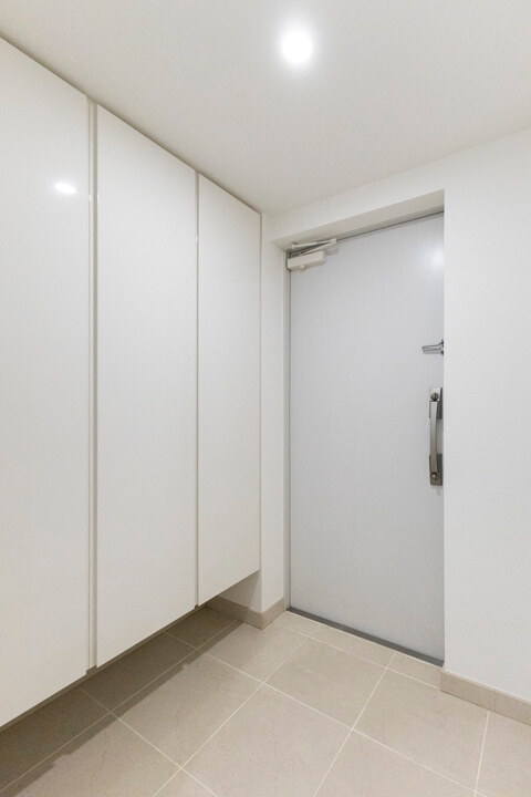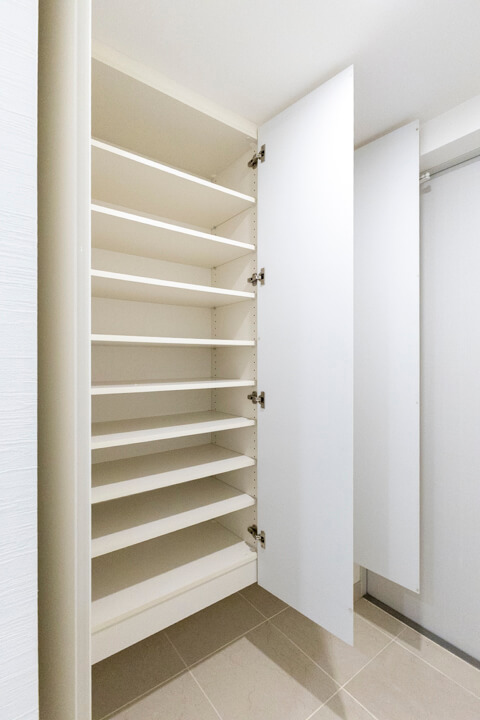 玄関には天井まで高さのある3枚扉のシューズボックスを完備。靴がたっぷり収納できます。また、廊下にもゆとりある物入や、約1.2帖の納戸も設けられていて収納スペースが充実しています。