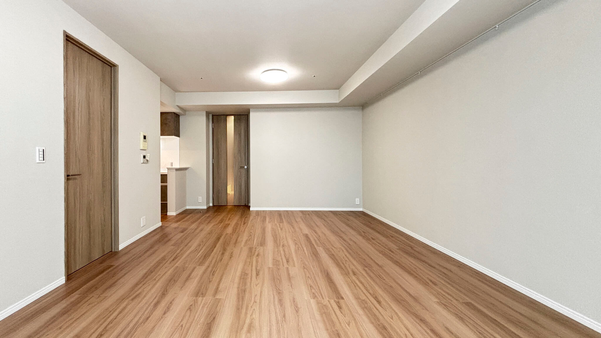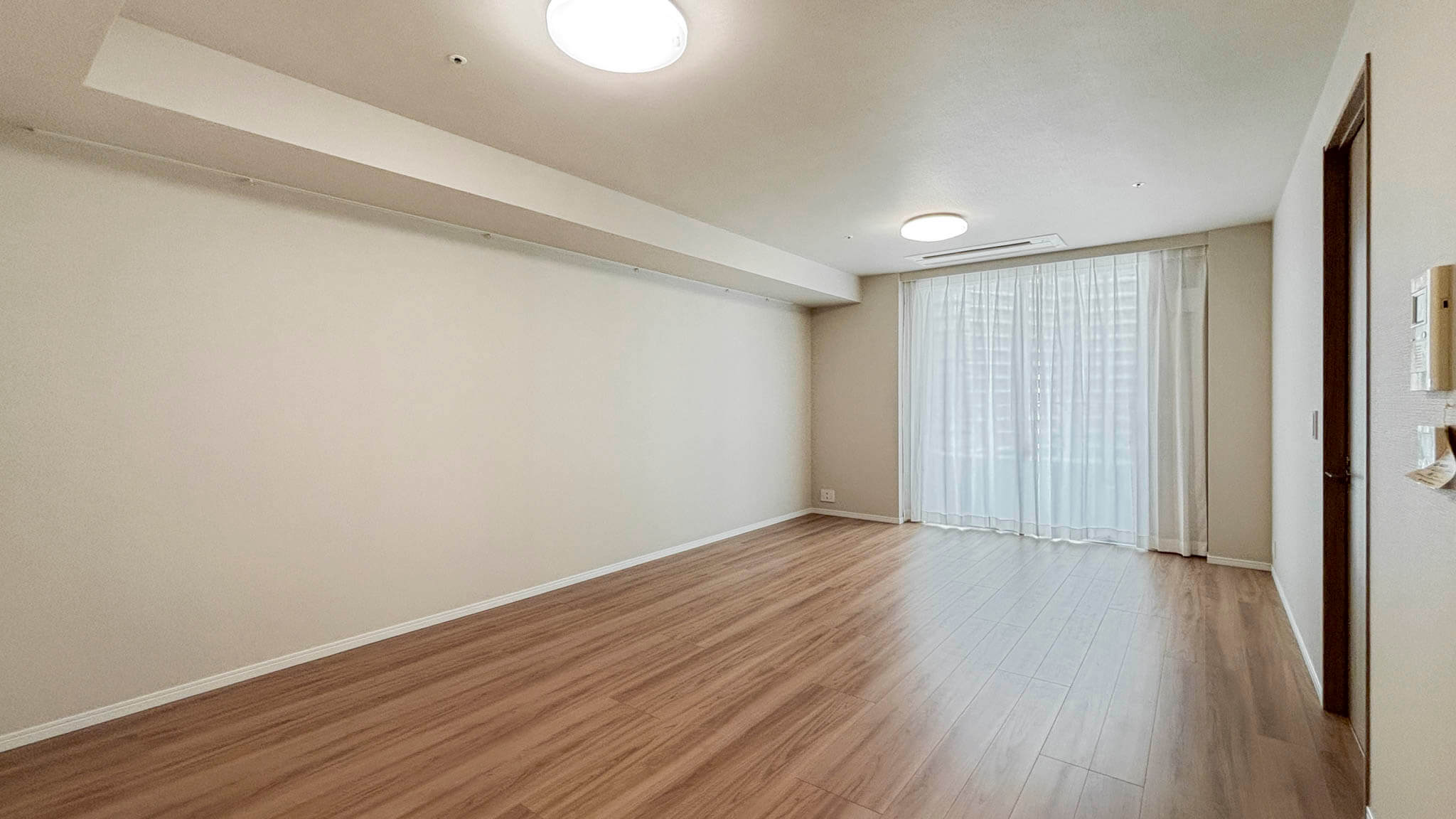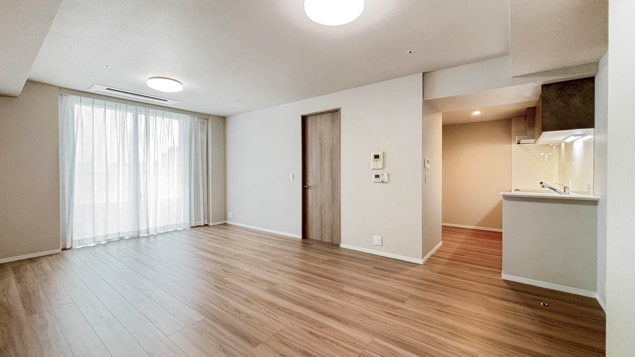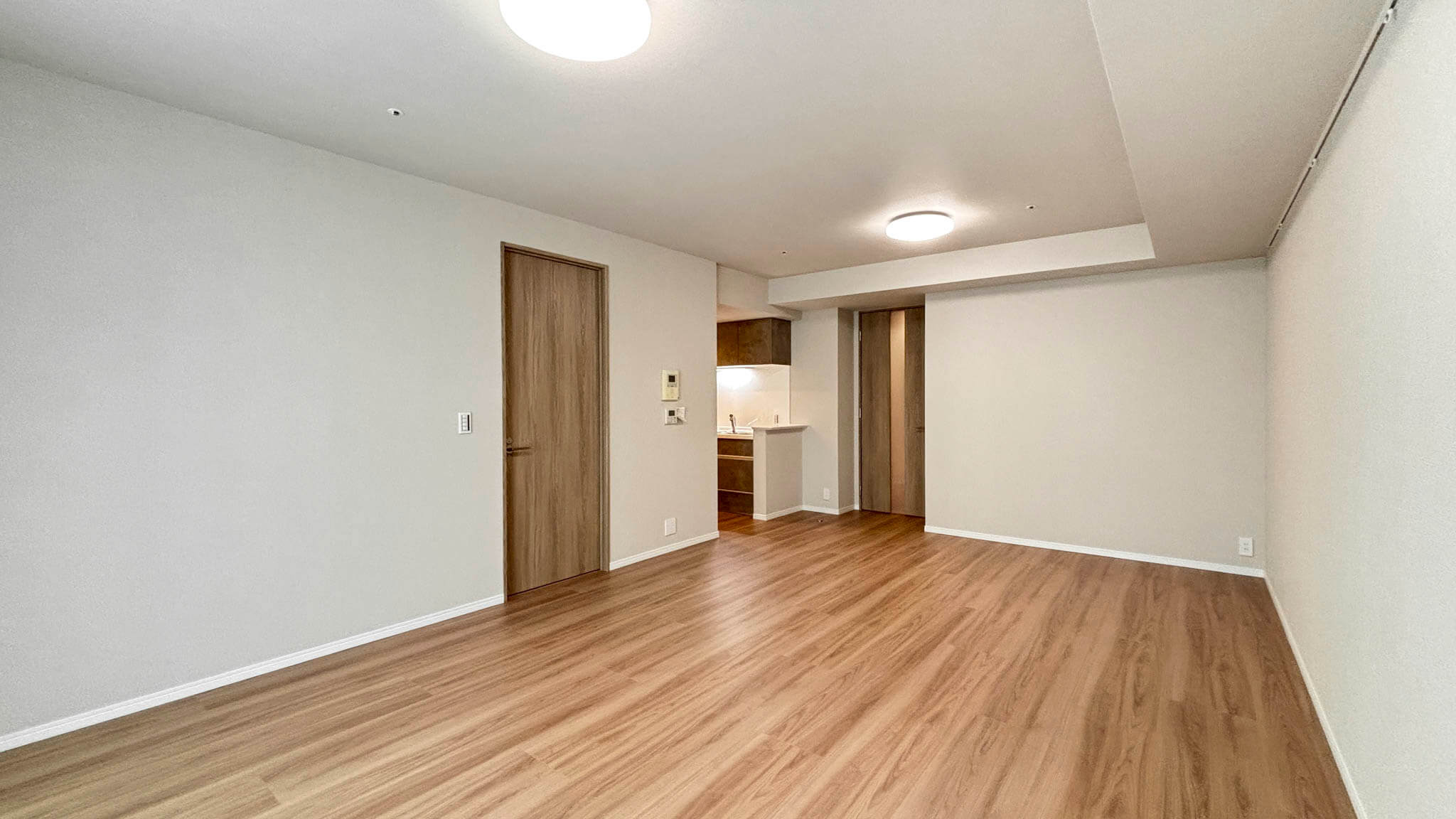 約15.2帖のリビングダイニング。大開口の窓から明るい自然光が降り注ぎます。室内はシンプルな壁クロスに木目のフローリング&建具を採用したナチュラルな内装。さまざまなテイストの家具選びを楽しめそうです。ピクチャーレールを活用し、掛けるインテリアを気軽に楽しめるのも嬉しいポイントです。