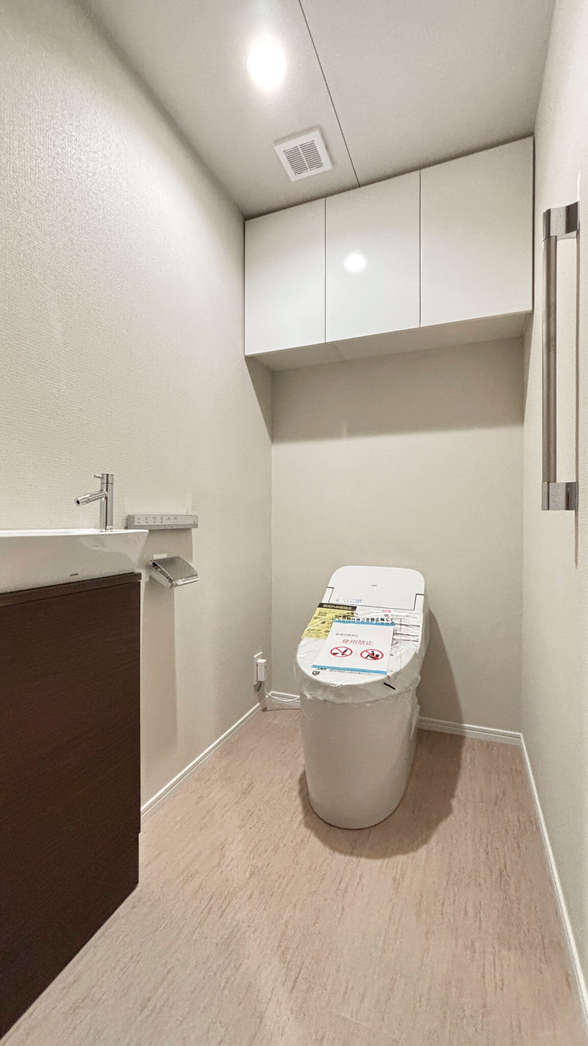 廊下に面していて独立性の高いレストルーム。スタイリッシュなタンクレストイレに交換済みです。手洗いカウンター付きなのですぐに手を洗うことができ、ゲストを洗面室まで案内する手間もかかりません。