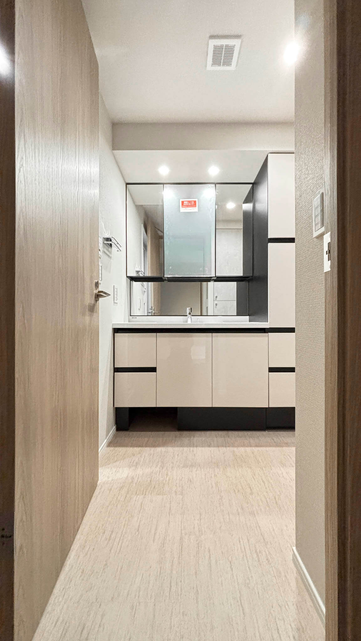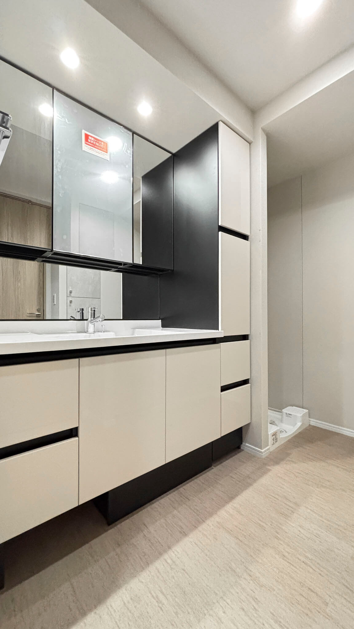 白と黒のコントラストが美しい、スタイリッシュな洗面化粧台。大きな三面鏡&ミドルミラー付きで身だしなみを整えるのに便利です。豊富な収納も魅力的です。
