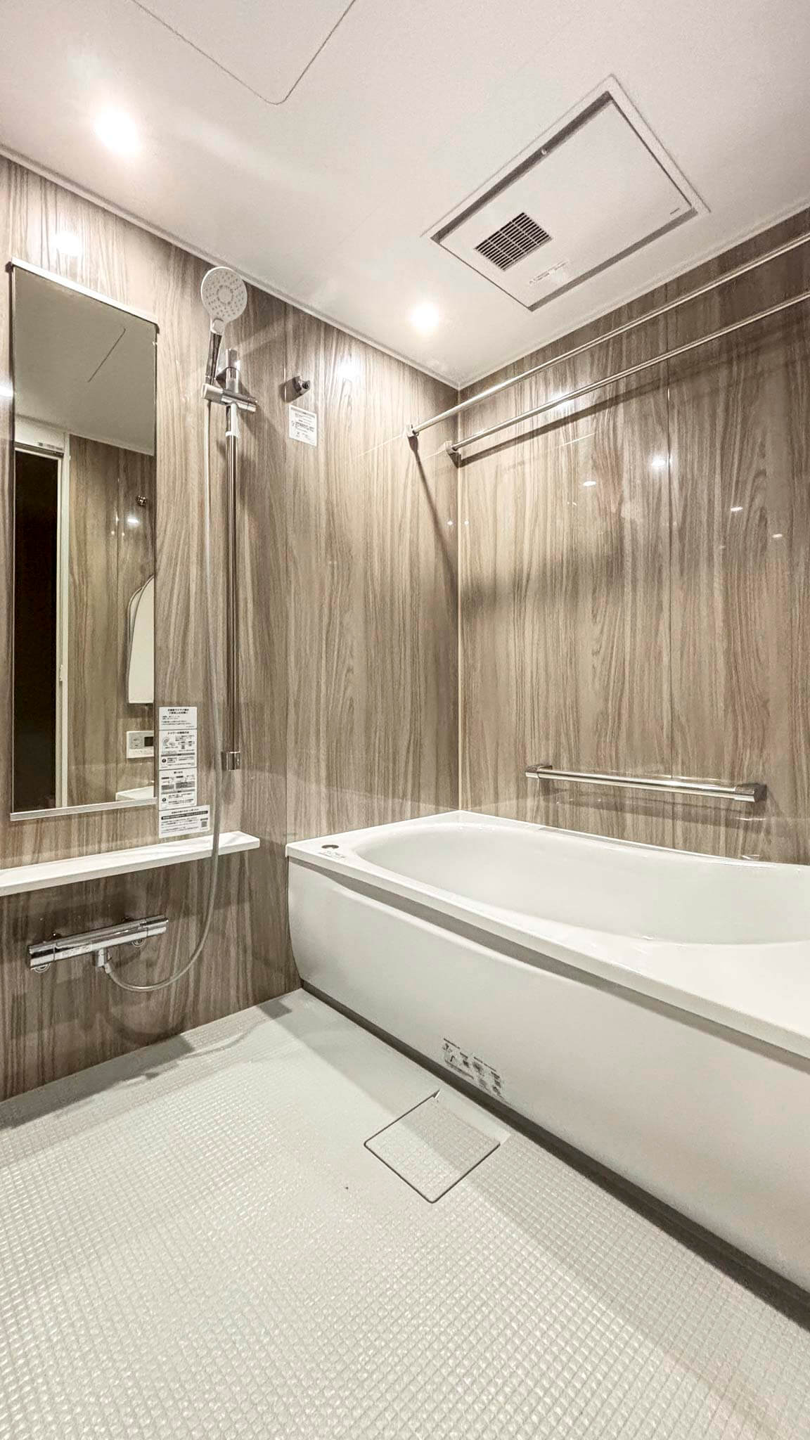 1418サイズのバスルーム。光沢のある木目柄パネルが、上質な安らぎの空間を演出します。換気・暖房・乾燥・涼風機能付きで1年中快適なバスタイムに。あたたかさをキープしやすい保温浴槽なのも嬉しいポイントです。
