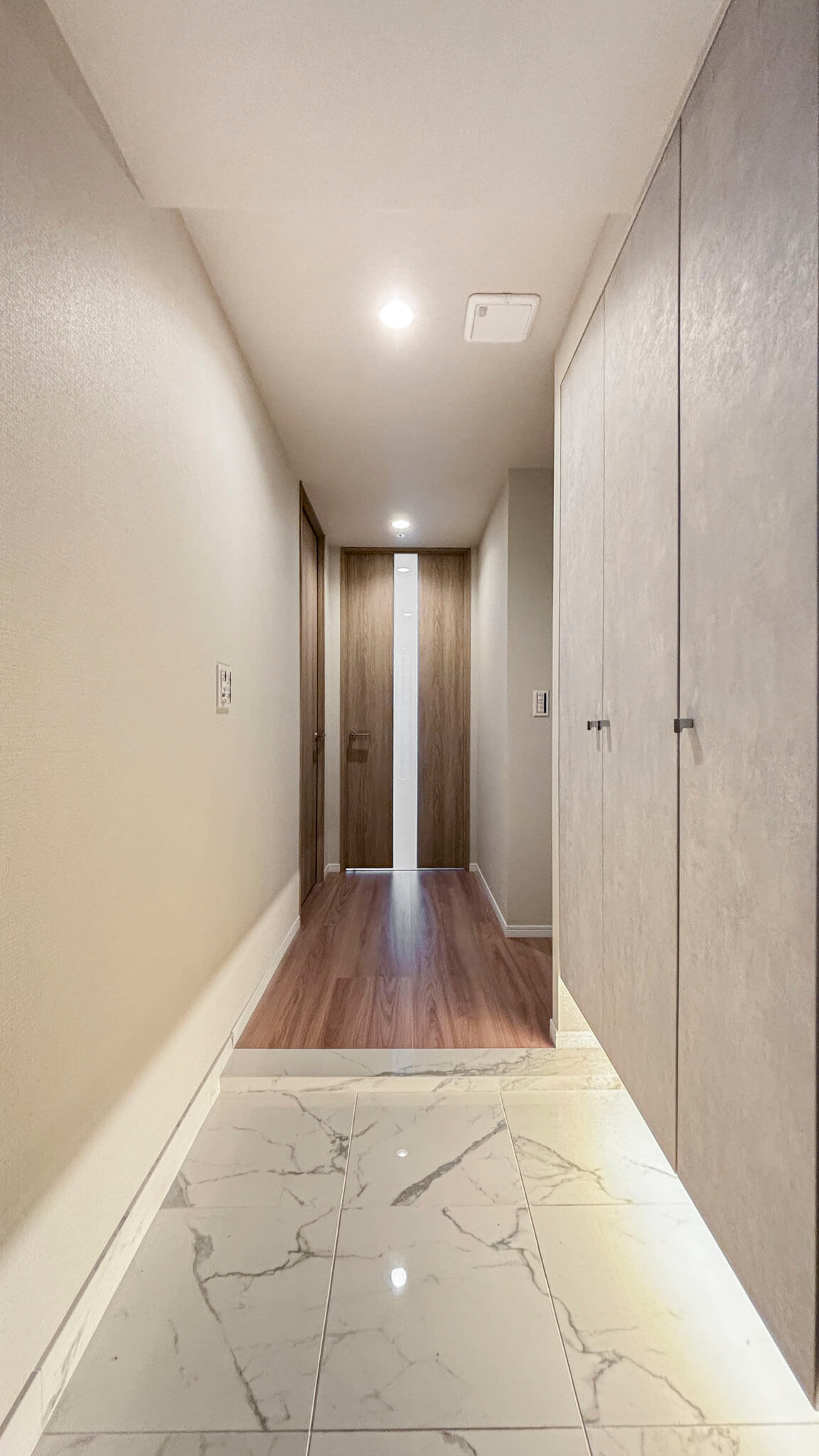光沢のある大理石調フロアで高級感の漂う玄関。フットライトの明かりが足元をやわらかく包み込みます。大容量のシューズボックス完備で、散らかりがちな靴をすっきり収納できそうです。