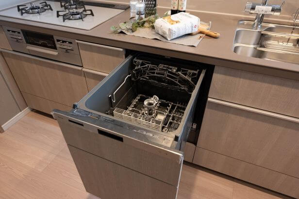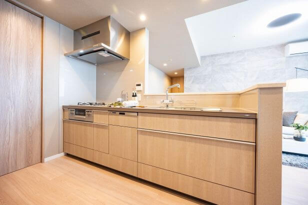 約3.8帖のキッチンスペース。家族やゲストと会話がしやすい対面型のシステムキッチン。家事の時短に心強い食洗機、料理が捗る3口ガスコンロ付きで設備も充実。キッチン奥の扉は洗面室へ通じています。