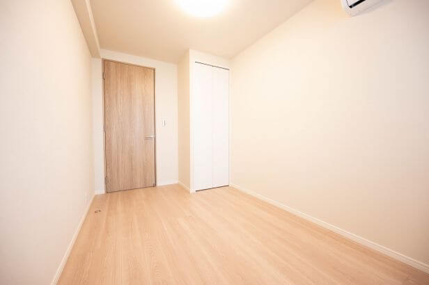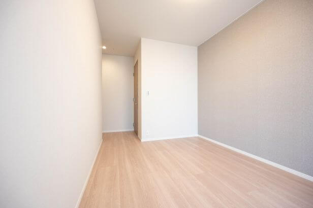約7.5帖の洋室1。グレーのアクセントクロスで落ち着きのある雰囲気。WIC(ウォークインクローゼット)付きで収納スペースもしっかり確保されています。