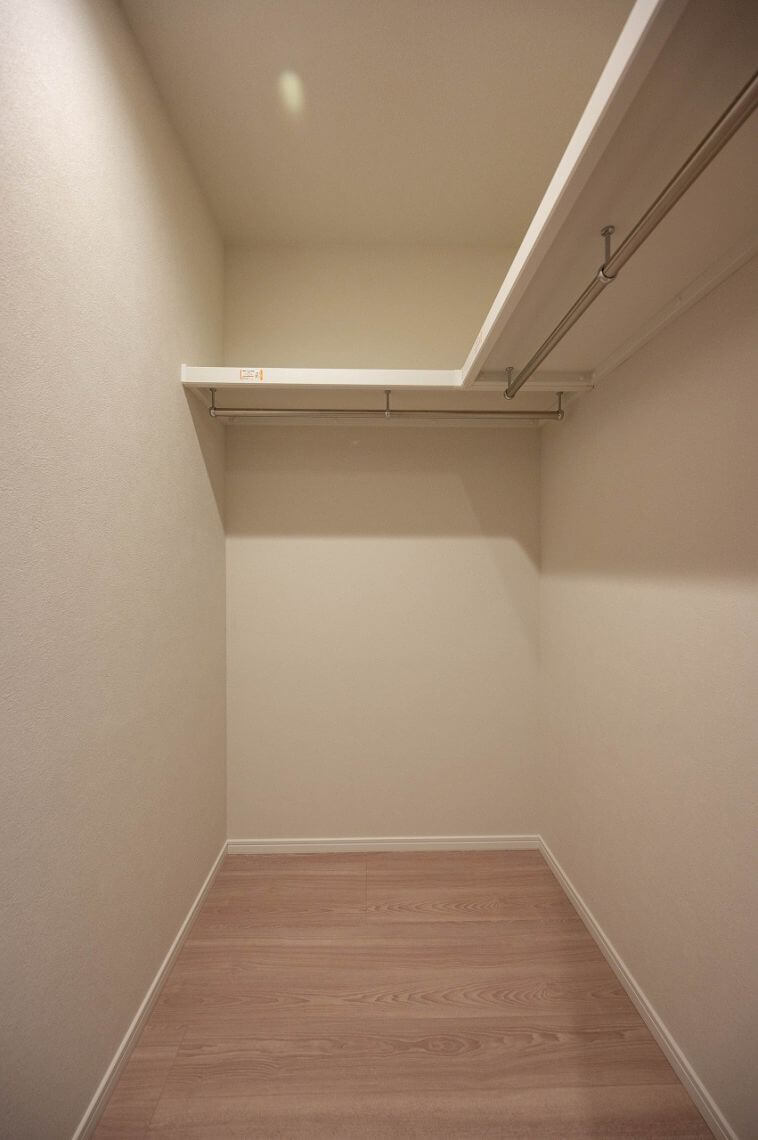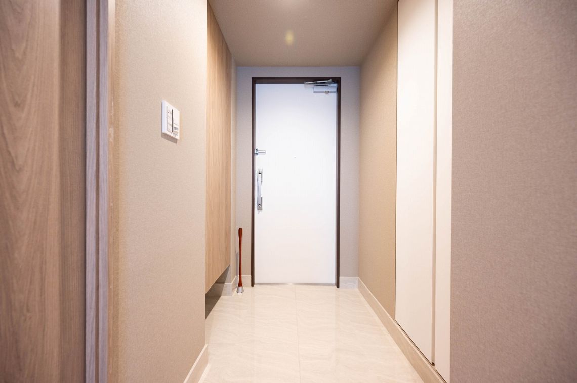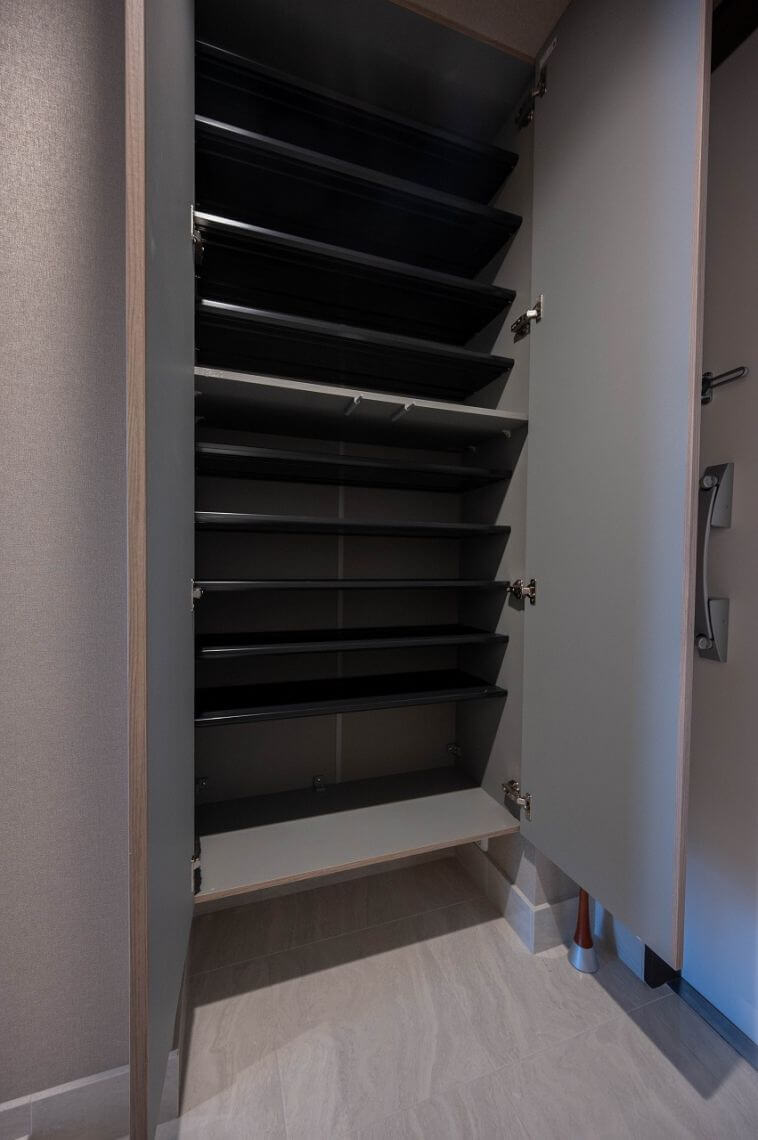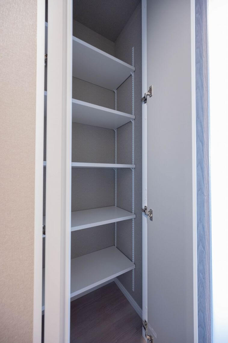 玄関には天井まで高さのあるシューズボックスを完備。シューズボックスの対面側にも物入が備わっていて、スポーツ用品やアウトドア用品の整頓に便利です。また、廊下にも別途収納スペースが備わっています。