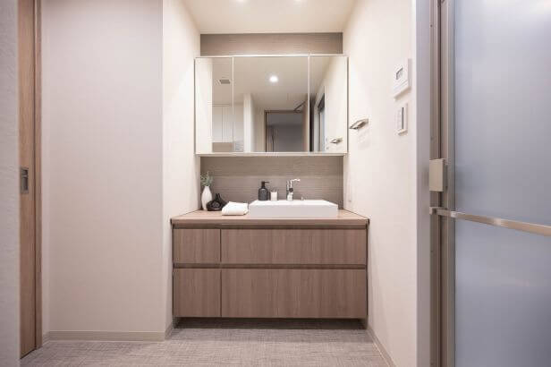 洗面室は廊下とキッチンの2方向から出入りできる便利な動線です。洗面化粧台は洗面まわりの小物がすっきり整頓できるミラーボックスや、物の出し入れがしやすい引き出しキャビネット付きで使い勝手の良さもポイントです。