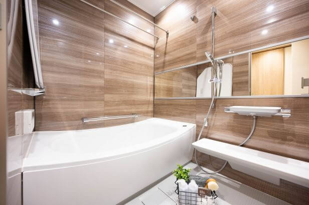 ウッド調であたたかみのある雰囲気のバスルーム。追い炊き機能の他、浴室換気乾燥機とランドリーパイプ2本付きで雨の日や冬場の洗濯にも困りません。