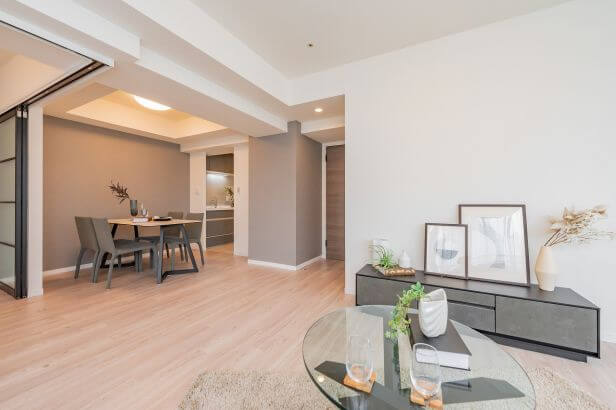 約14.3帖のリビングダイニング。朝の光が心地良い東向きです。隣接していつ洋室と繋げて広々とした感覚で過ごすことも可能。床にドアレールがないので見た目もすっきりとした印象です。また、床暖房が設置されていて、冬場でも足元からじんわりと温まれます。床に直接座ったり、寝転んでもひんやり感を感じさせません。