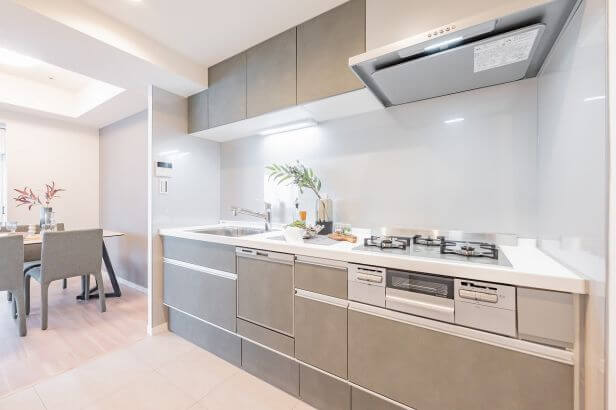 約3.3帖のキッチンスペース。料理が捗る3口ガスコンロ、家事の時短に心強い食洗機付きです。物の出し入れがしやすい引き出し式のキャビネットで使い勝手の良さもポイントです。
