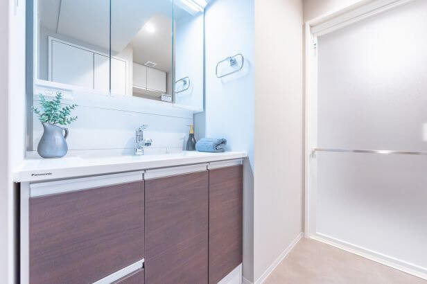 洗面化粧台は洗面まわりの小物がすっきり整頓できるミラーボックス付き。いつでも整った状態をキープできそうですね。