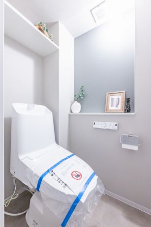 廊下に面したレストルーム。手洗いタンク付きのトイレを採用。カウンター付きでアートを飾ったり、空間に彩りをプラスできます。ウォシュレット、収納棚も備わっています。
