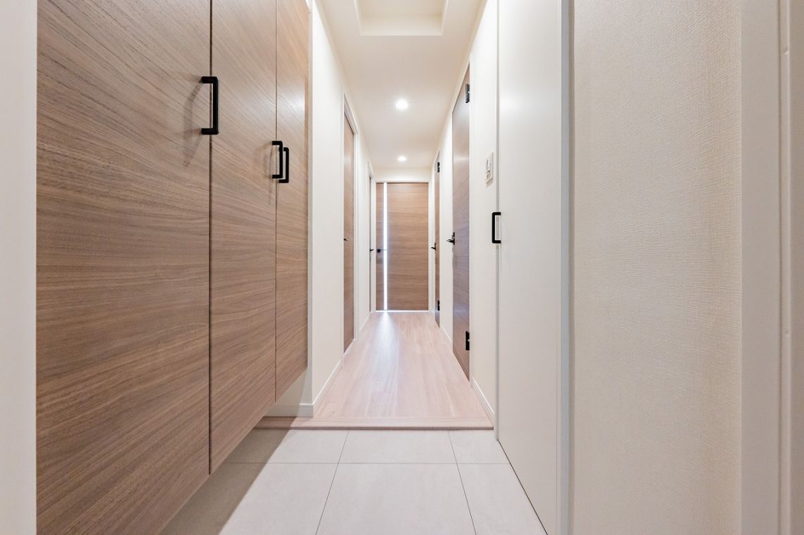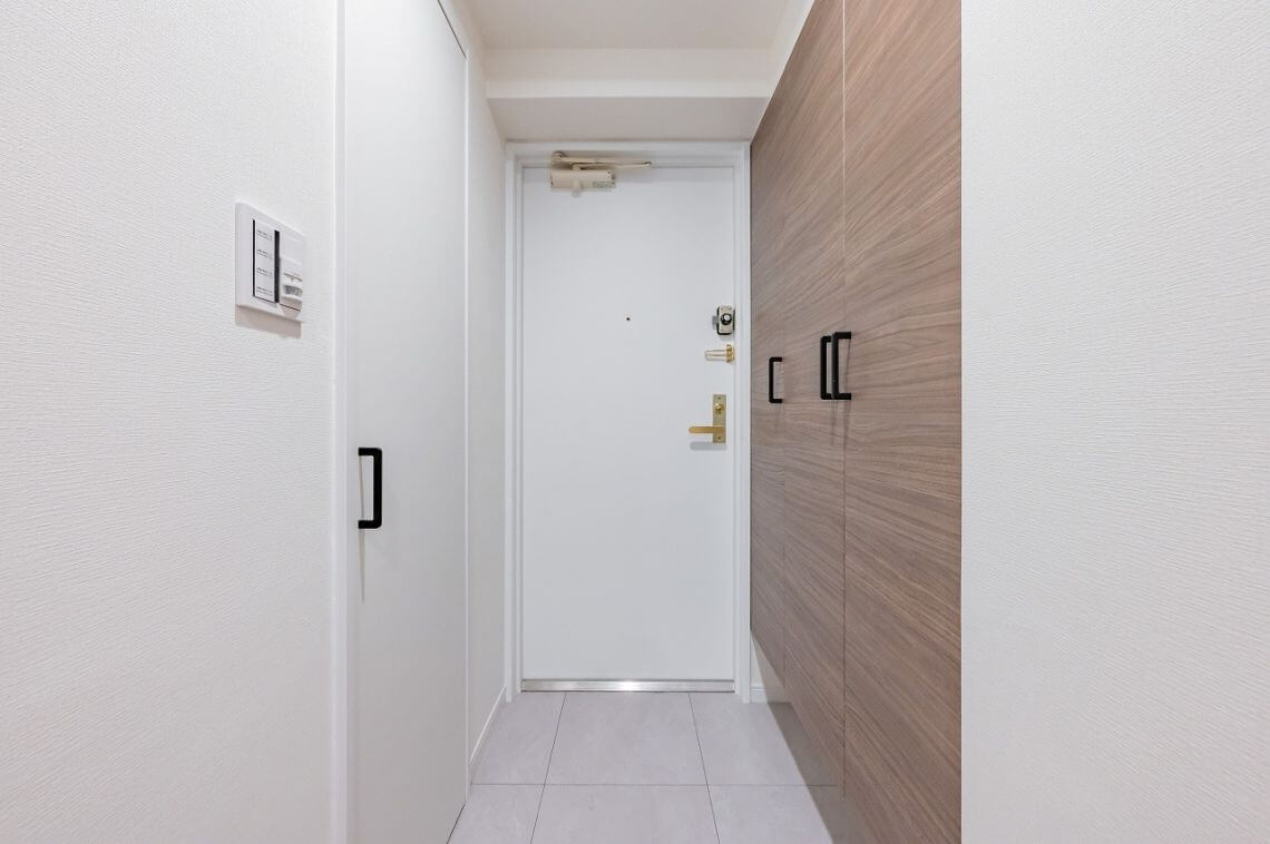 玄関には3枚扉のシューズボックスを完備。靴がたっぷりと収納できます。また、シューズボックスの対面側にも物入が設けられています。